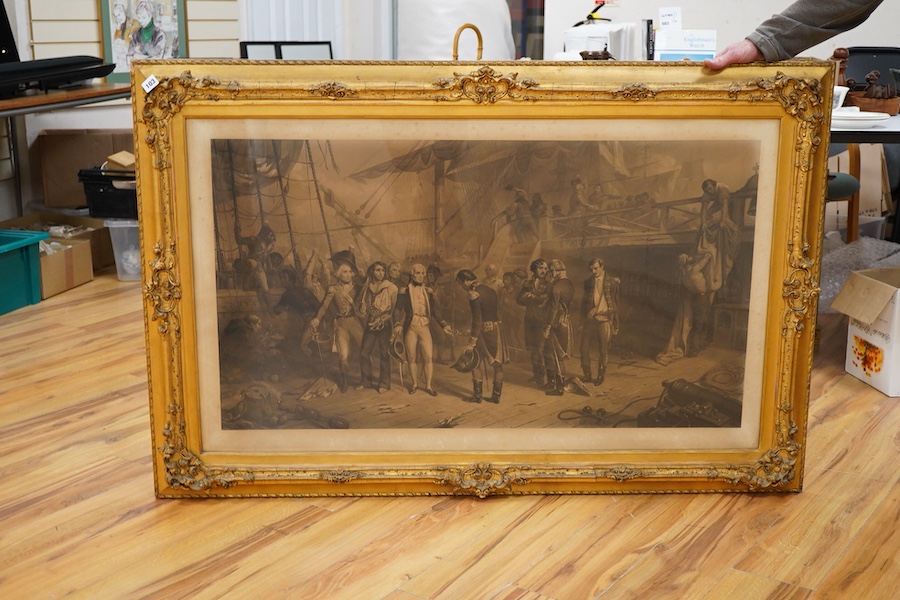 Lot 103 , A 19th century gilt framed engraving after the painting by Thomas Jones Barker of Admiral Lord Nelson receiving the swords on board the San Josef after the Battle of Cape St. Vincent in 1797, overall dimensions of the fr