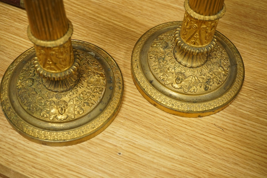 A pair of 19th century of gilt brass Corinthian style candlesticks, 34cm