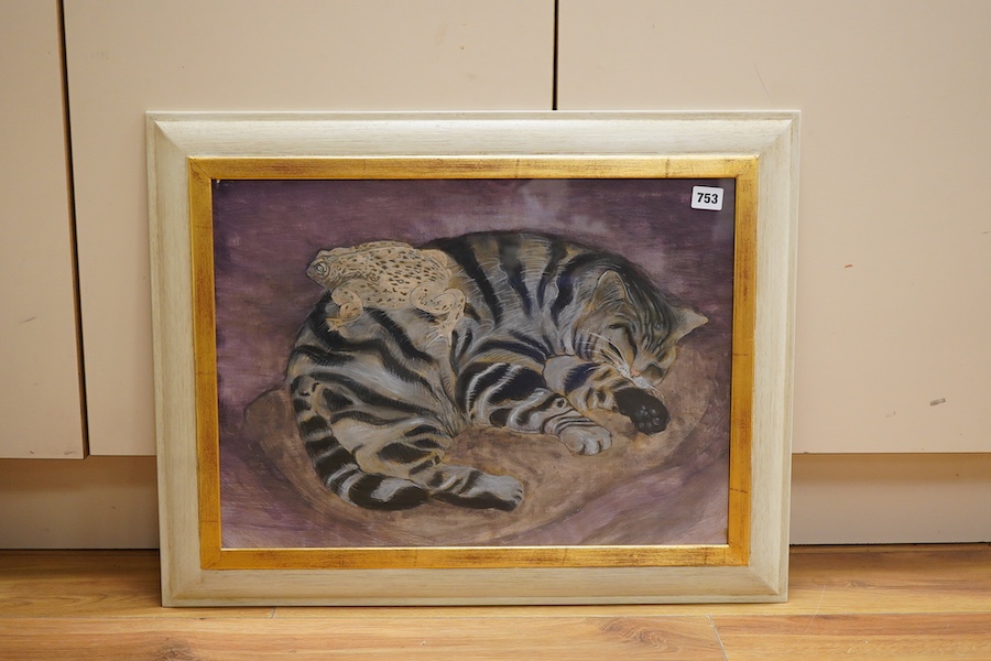 Lot 753 , Late 20th century, study of a cat and toad, indistinctly signed, mixed media, 38 x 53cm