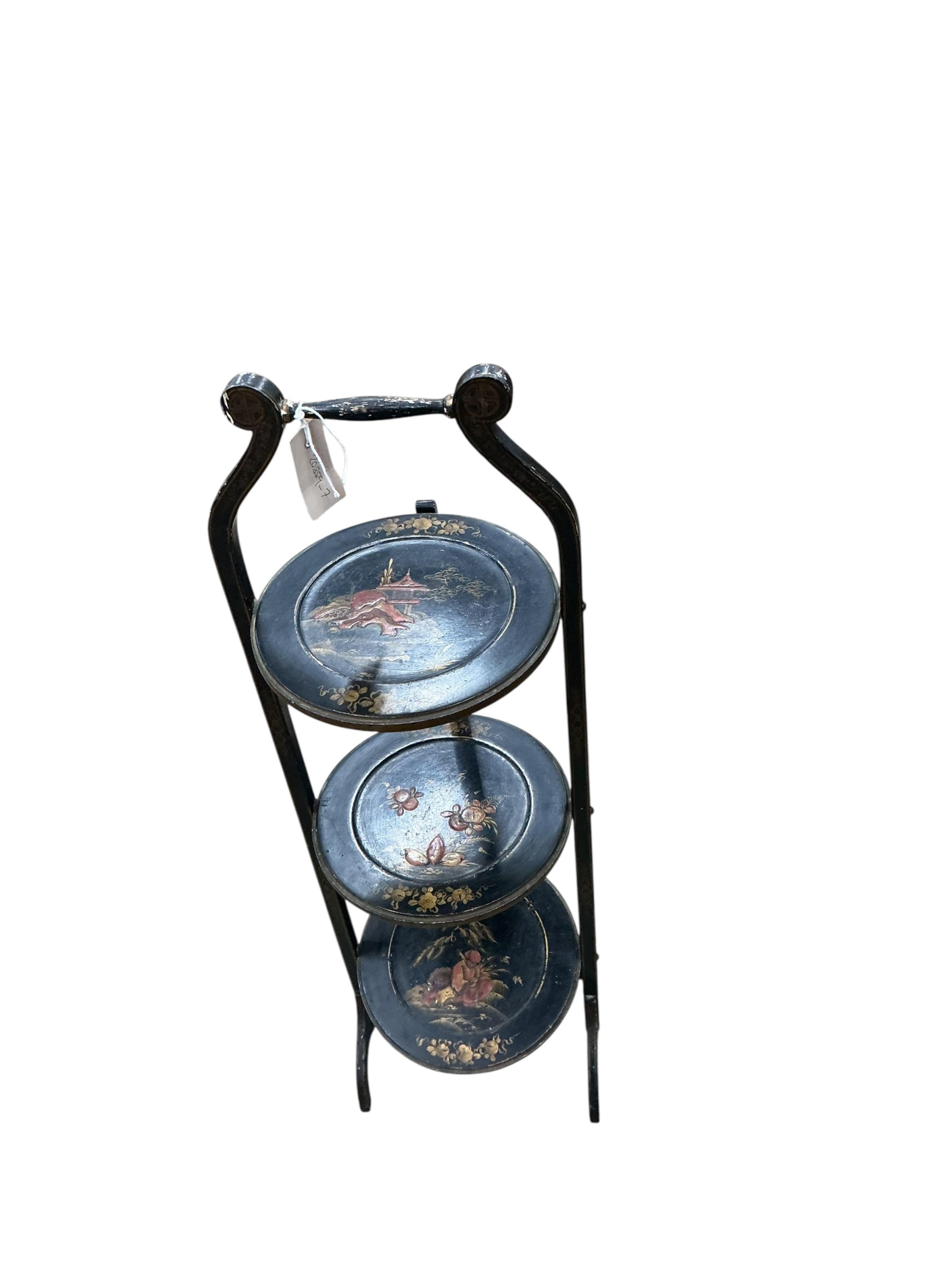 Lot 1021 , A 1920's chinoiserie lacquer three tier folding cake stand, width 27cm, depth 20cm, height 89cm