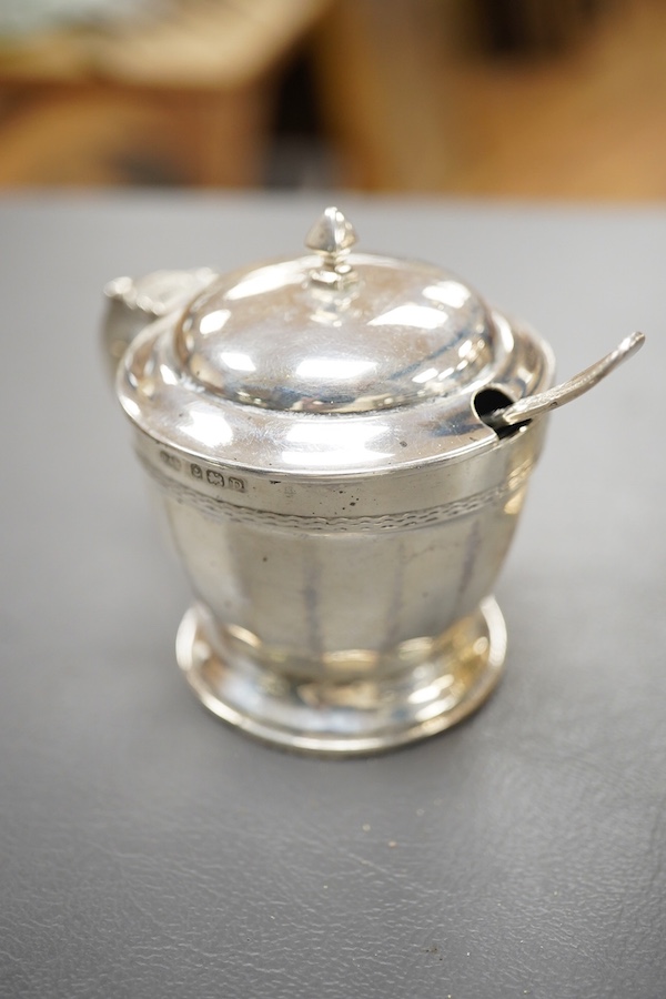 A George V silver three piece condiment set by Deakin & Francis, Birmingham, 1928, together with two associated spoons, one silver.