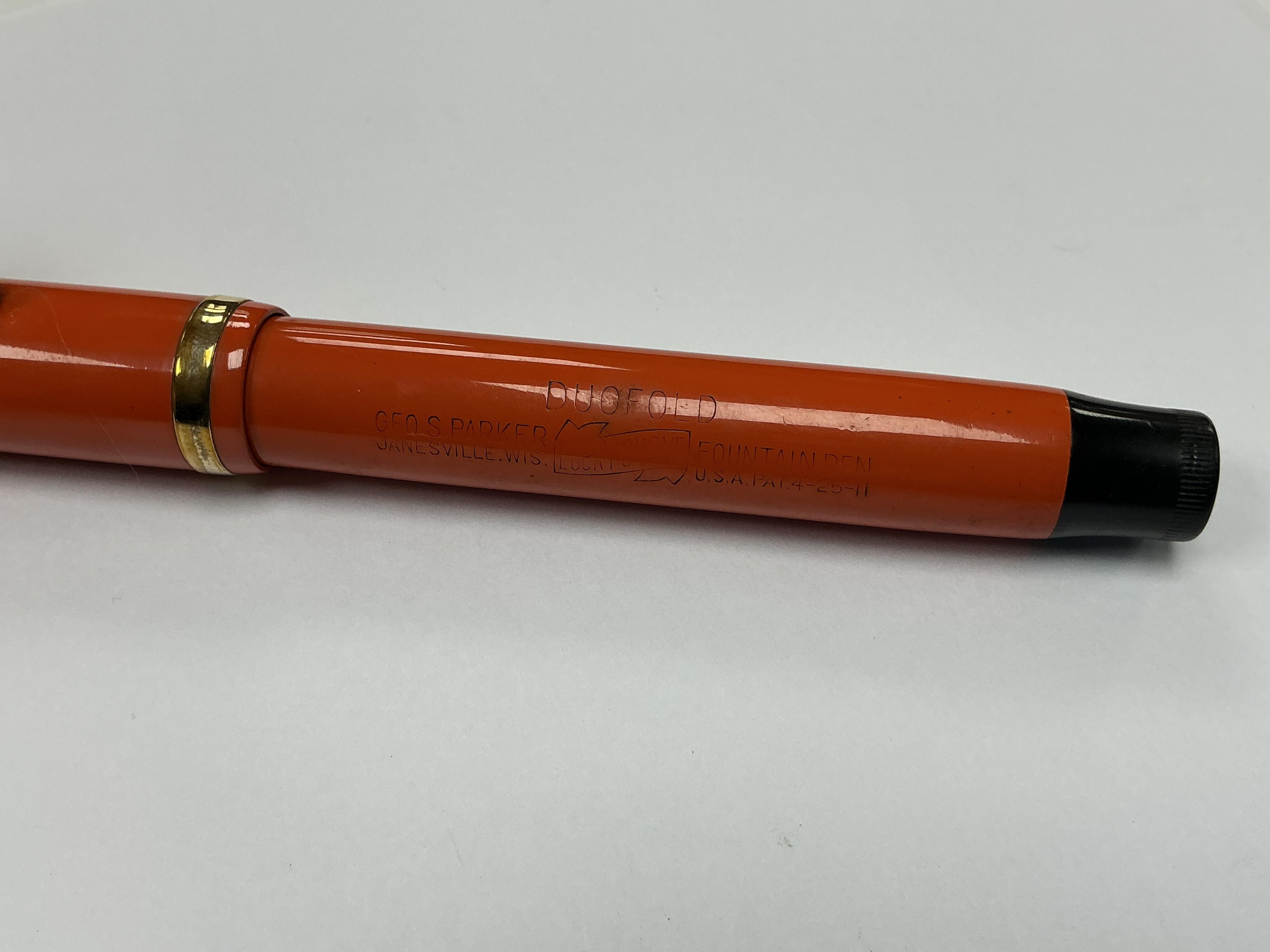 Lot 95 , A Parker Lucky Curve Duofold Senior in red hard rubber with 'large' barrel imprint