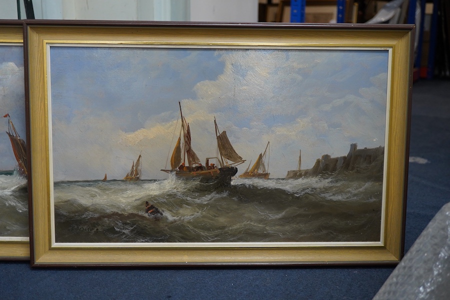 J. Jones, shipping scenes, each signed, pair of maritime interest oils on board, 29 x 49cm