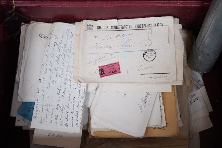 Large collection of manuscript letters and autographs from the late 19th to early 20th century. Housed in a contemporary leather suitcase. Letters and autographs from a wide variety of statesmen, politicians, clergy, legal, literary, artistic and scientific figures. Highlights include Marconi, Lord Kelvin, Paul Kruger, Archbishop of Dublin, Bishop of London, Andre Thevrier, Pressene, John Bright, Oliver Lodge, Lord Roseberry. with a few pieces of ephemera include a cheque to the Princess of Hess dated 1866 and a regimental warrant from 1855. some letters on war office paper. With a metal tube containing 19th/20th C certificates relating to nursing.