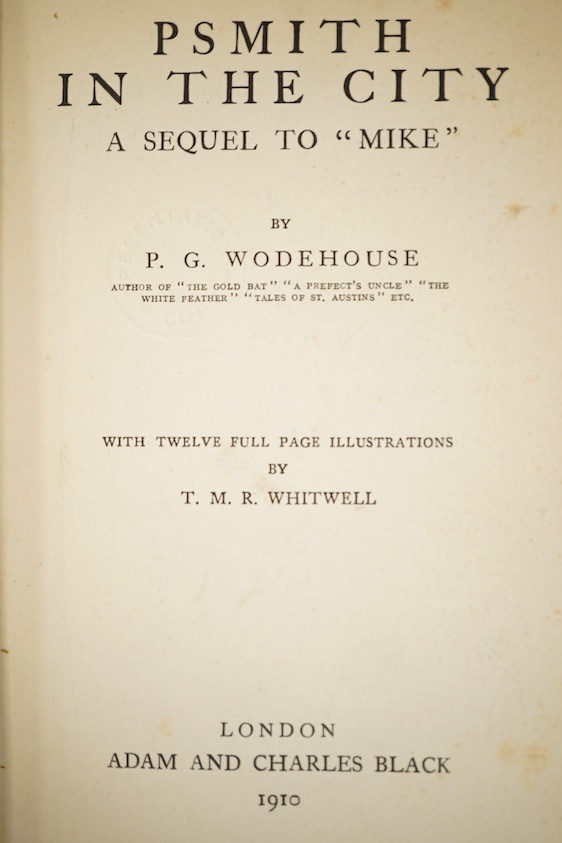 ° Wodehouse, P.G. - PSmith in the City: a sequel to "Mike". 1st Edition. 12 plates, half title & advert. leaf; original coloured pictorial cloth ( neatly rebacked with original spine mounted). Adam and Charles Black, 1910; Wodehouse, P.G. - The Head of Kay's. 1st Edition. 8 plates, half title, original coloured pictorial cloth. Adam and Charles Black, 1905 (2).