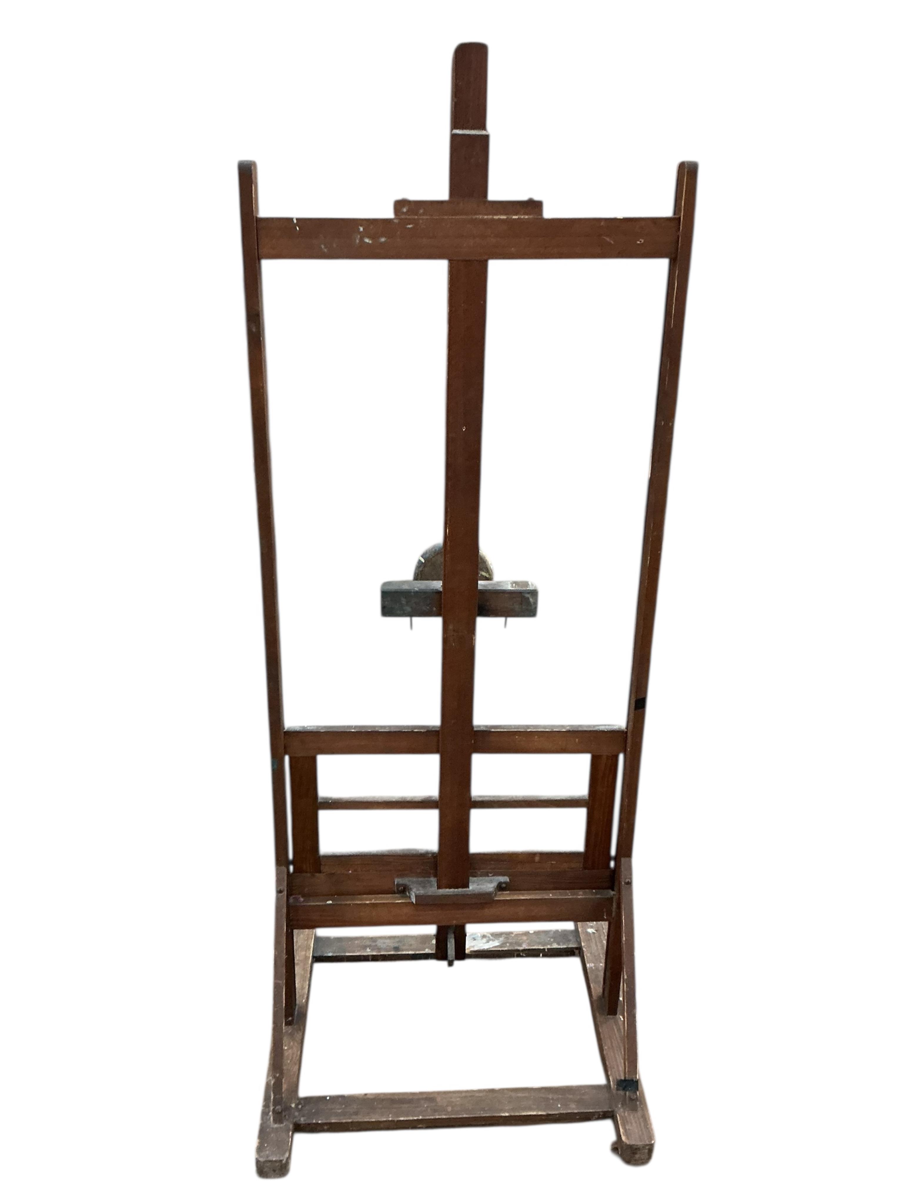 An early 20th century artist's studio easel, width 65cm, depth 60cm, height 248cm fully extended