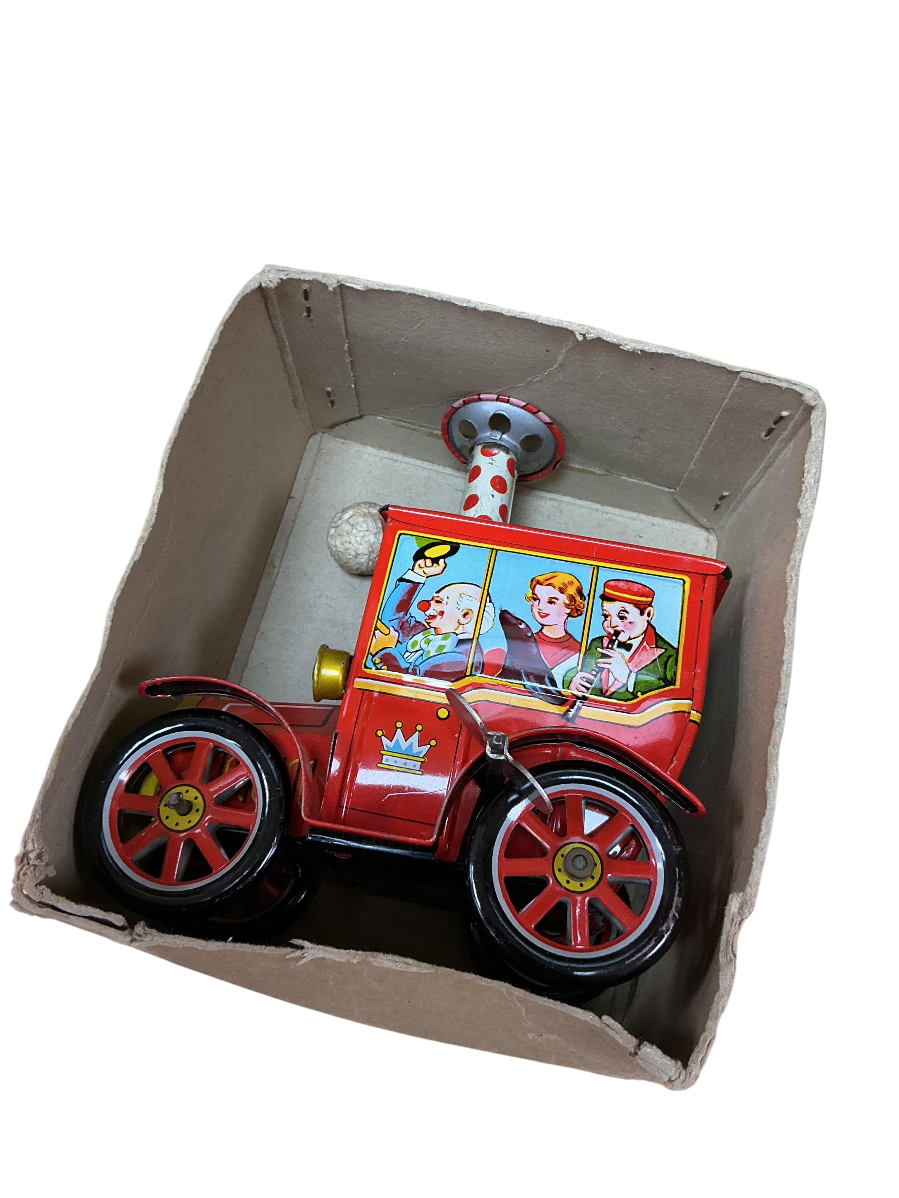 Four Tri-ang Minic clockwork tinplate vehicles including a London bus with the remains of its box, a boxed Cabriolet in blue, a limousine, and a caravan, together with the chassis and motor of another, plus two Schuco miniature figures, a monkey and a teddy bear, a boxed 1950s KO (made in Japan) tinplate clockwork Circus Car, and a small quantity of Lone Star 000 model railway