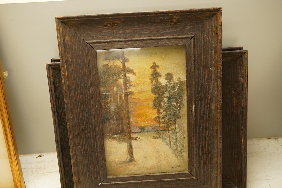 J. Dunlop, winter landscapes, each signed and dated ‘19, a set of three oils on card, oak framed, 21 x 14cm