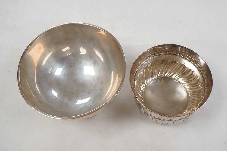 A late Victorian repousse silver bowl, London, 1885, diameter 91mm, together with a later silver bowl on a pedestal foot, London, 1907.