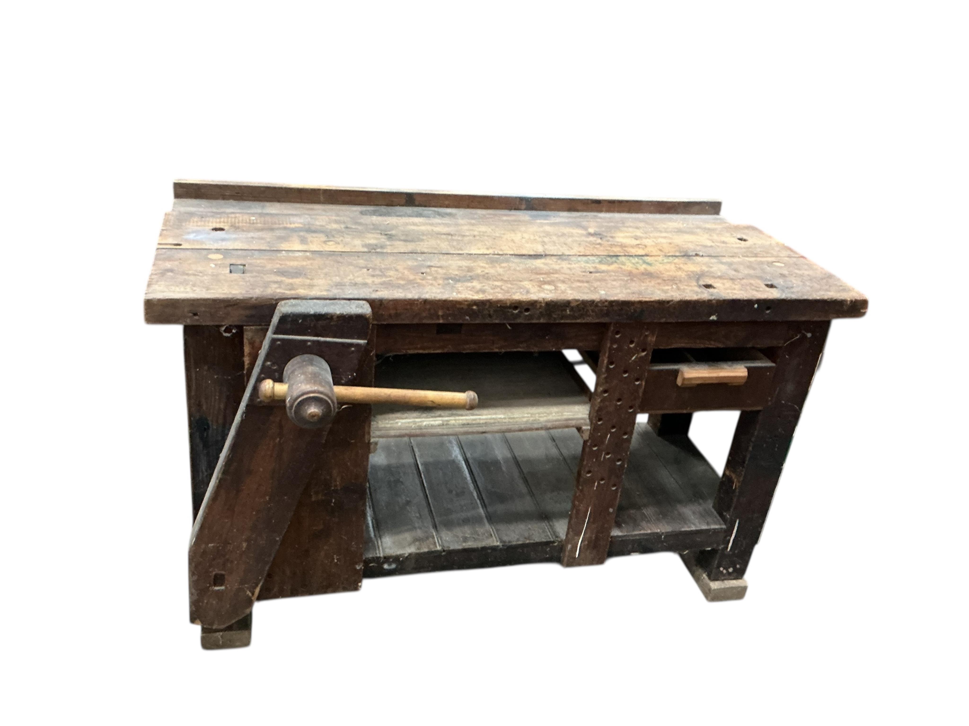 Lot 1032 , An oak and pine work bench with vice, width 138cm, depth 80cm, height 81cm