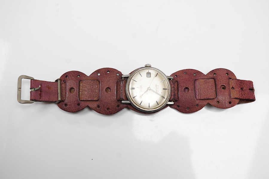 A gentleman's 1960's? stainless steel Omega Seamaster De Ville Automatic wrist watch, with baton numerals and date aperture, case diameter 32mm, on a later associated leather strap.