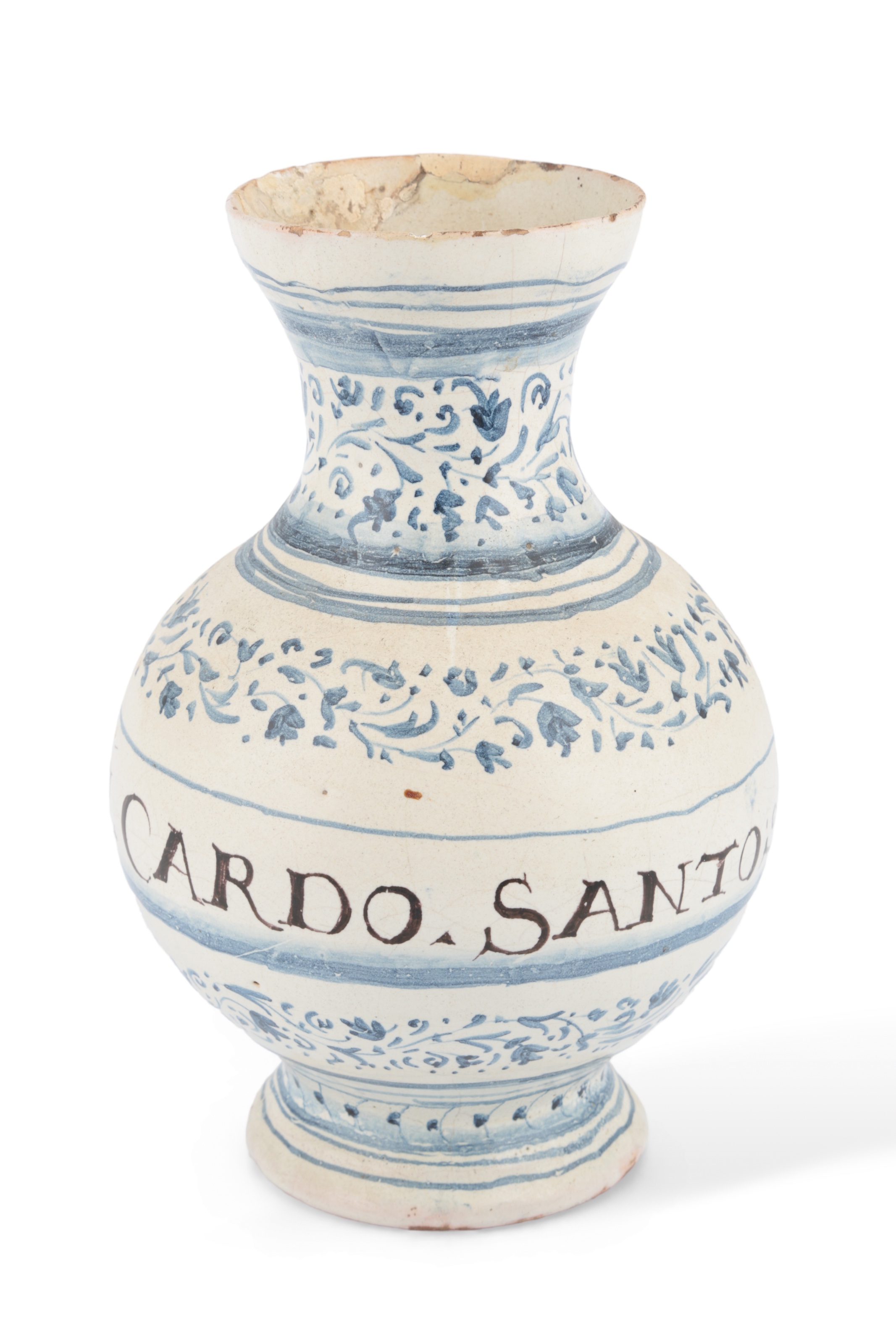 the bottle bars decorated with chinoiserie panels, 25cm high, the drug jar with title "AQ. DI. CARDO. SANTO"., 24cm high