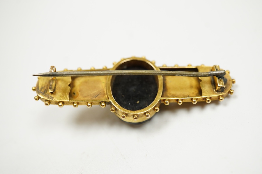 A Victorian yellow metal and hardstone cameo set bar brooch, with cannetille work decoration and carved wit the bust of a lady to dexter, 50mm, gross weight 10 grams.