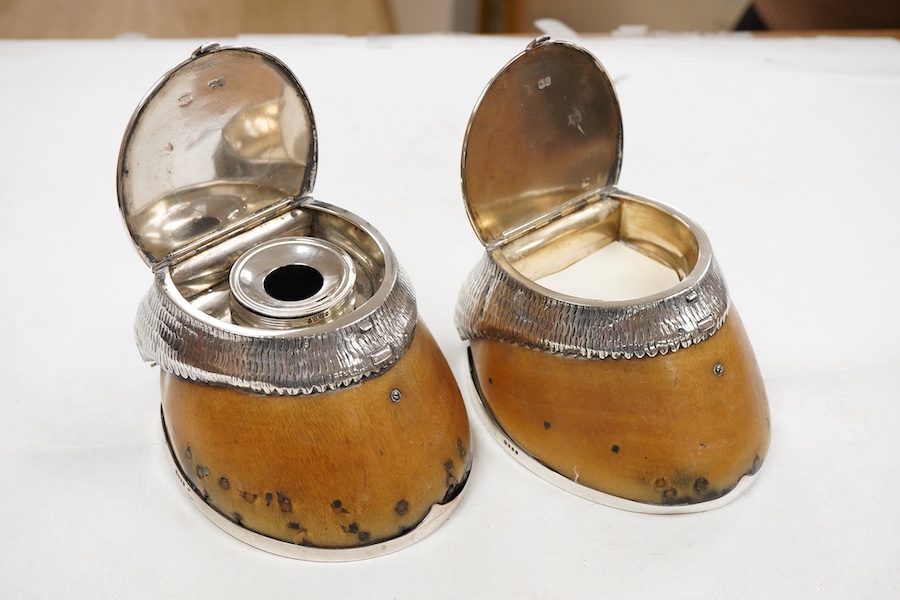 Lot 1834 , A pair of Victorian silver mounted horse hoof inkwells, with engraved inscription and monogram(worn), makers mark rubbed, London, 1875, (a.f.), height 73mm.