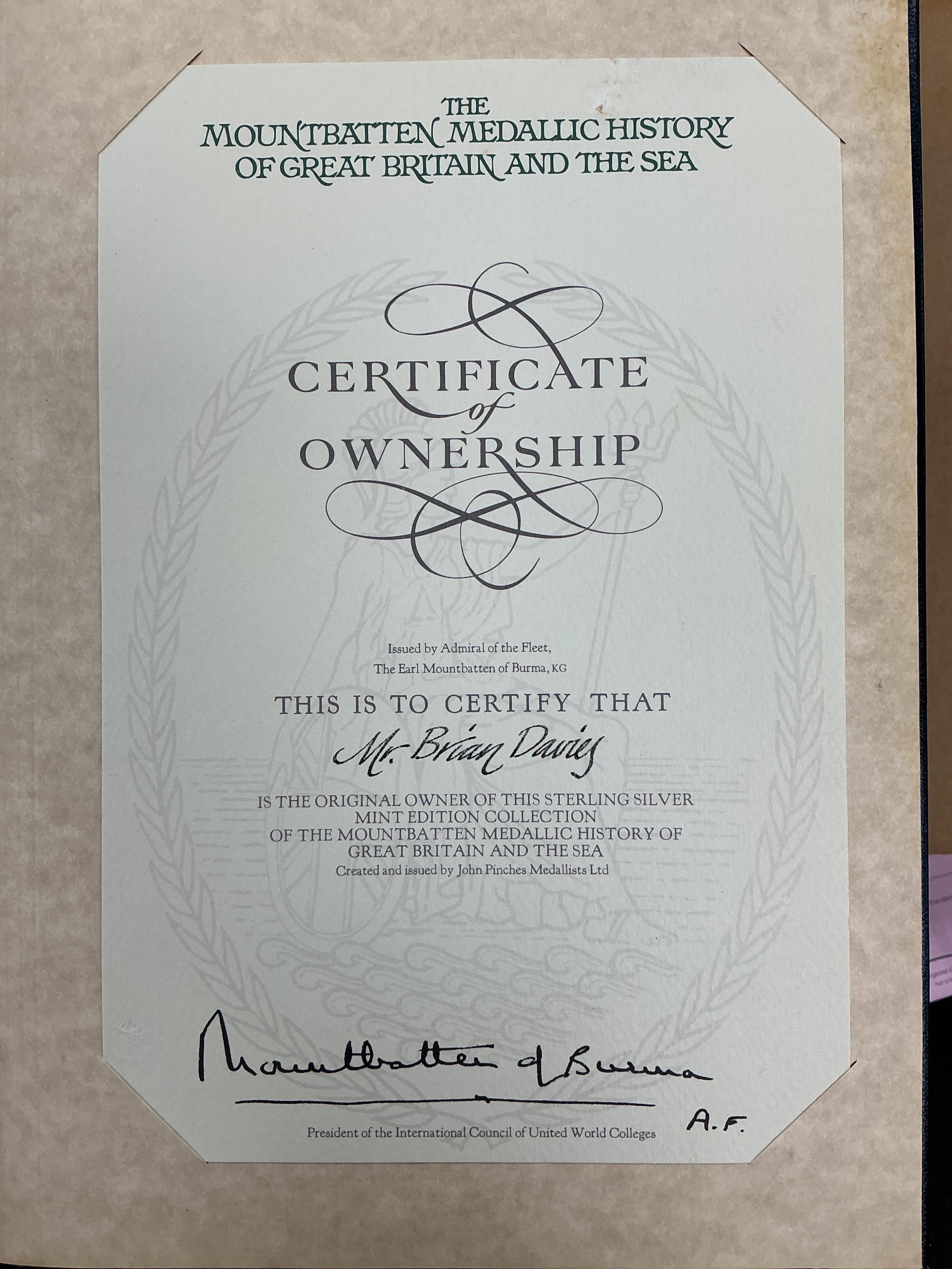 100 silver proof medals - The Mountbatten Medallic History. of Great Britain and the Sea, minted by John Pinches medallists Ltd., Each medal approximately 40.1 g