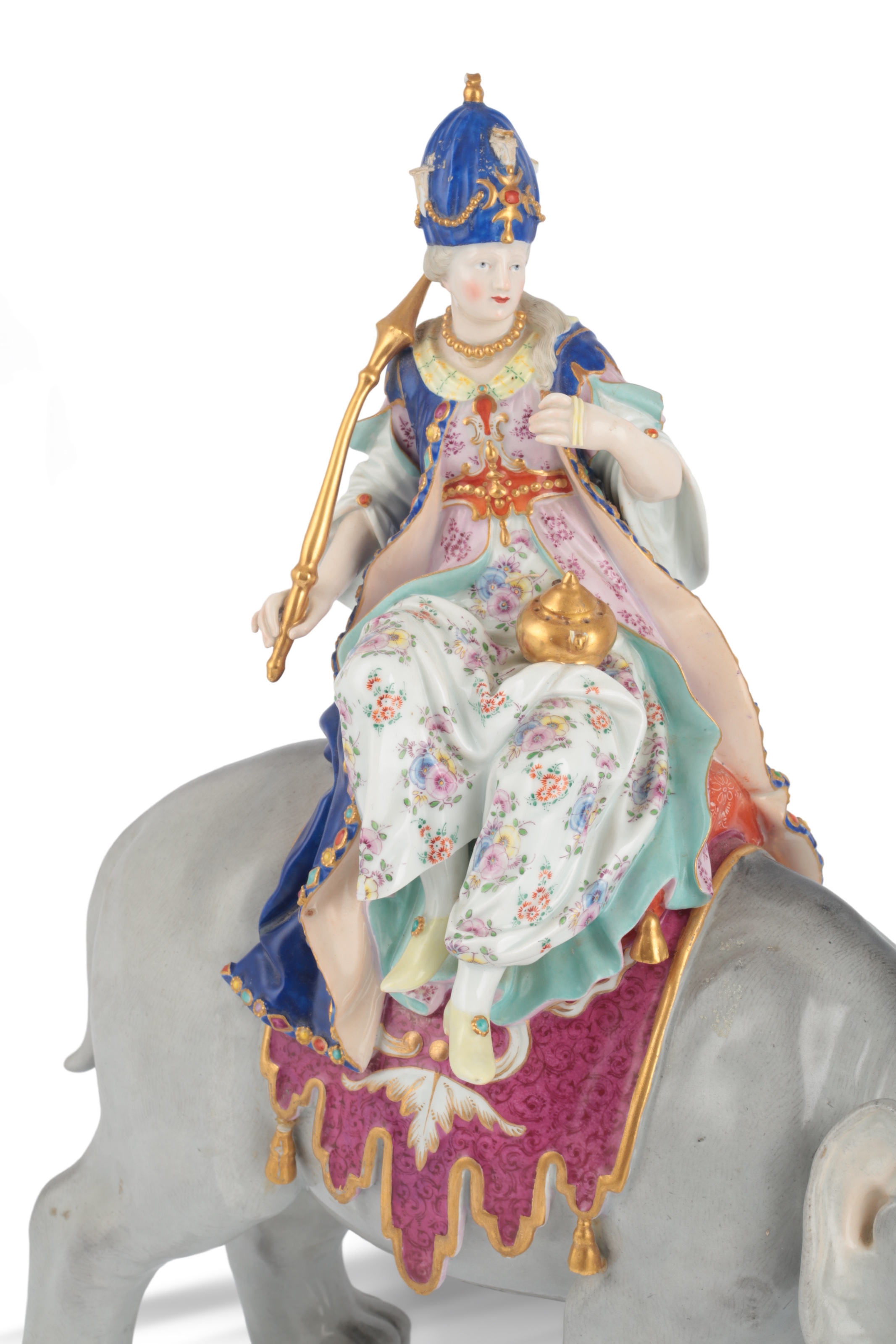 the figure of the Sultana wearing bejewelled robes, seated on a caparisoned elephant, underglaze blue cross swords mark, 41cm high, 41cm long