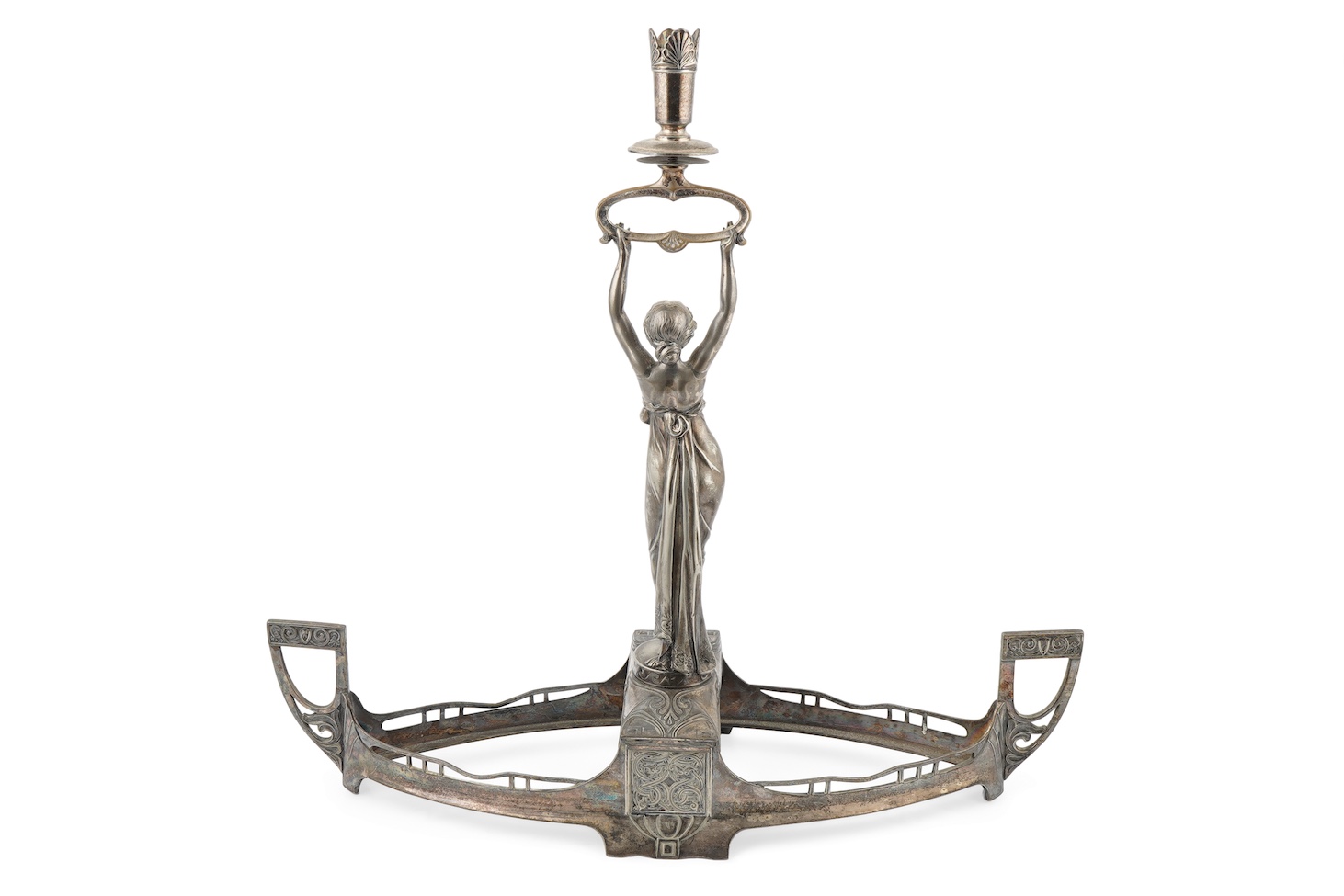 Manner of WMF: A table centrepiece, modelled with a central maiden holding aloft a single candle sconce, standing on the central section of a navette-shaped base (lacking glass liners), 47cm x 50cm