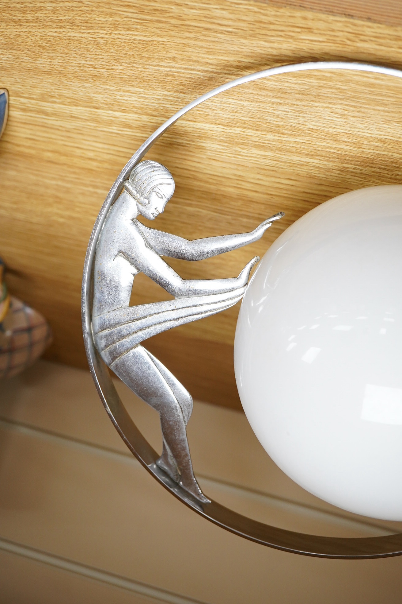 Lot 3174 , An Art Deco ceiling light lamp featuring a polished chrome silhouette of a female figure, length 56cm.