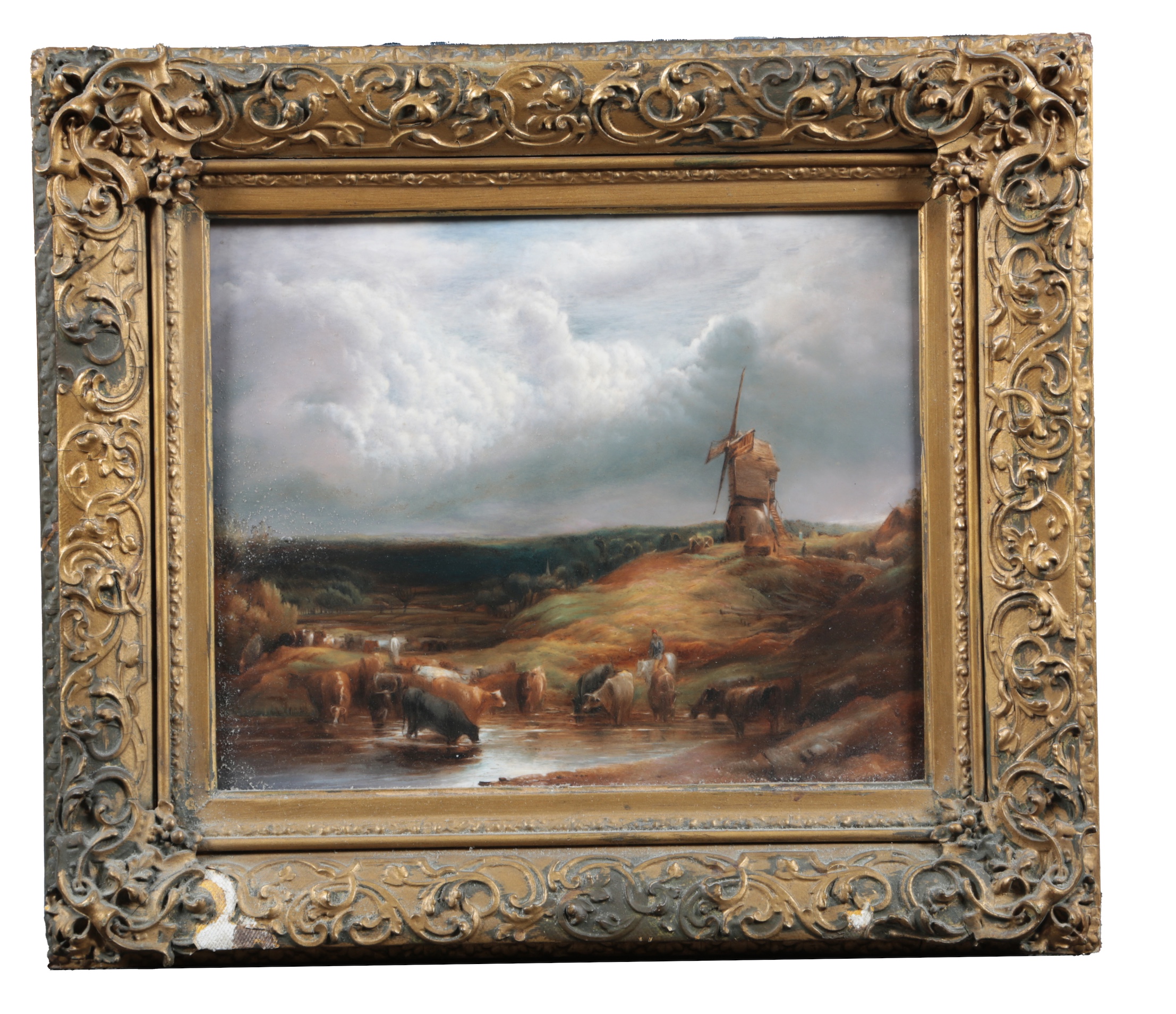 painted with cattle by a windmill in a landscape, inscribed verso, 31cm x 38.5cm, in a gilt and composition frame