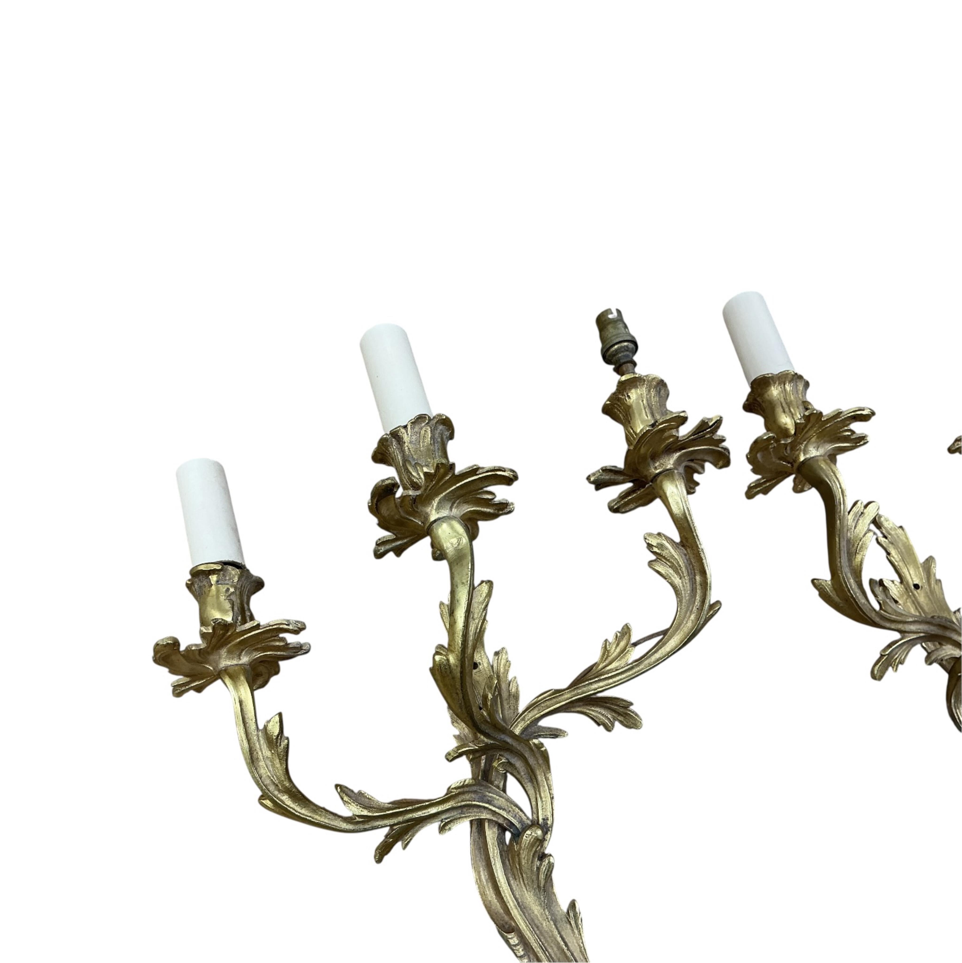 A pair of brass Louis XV style three branch wall sconces, 51cm high