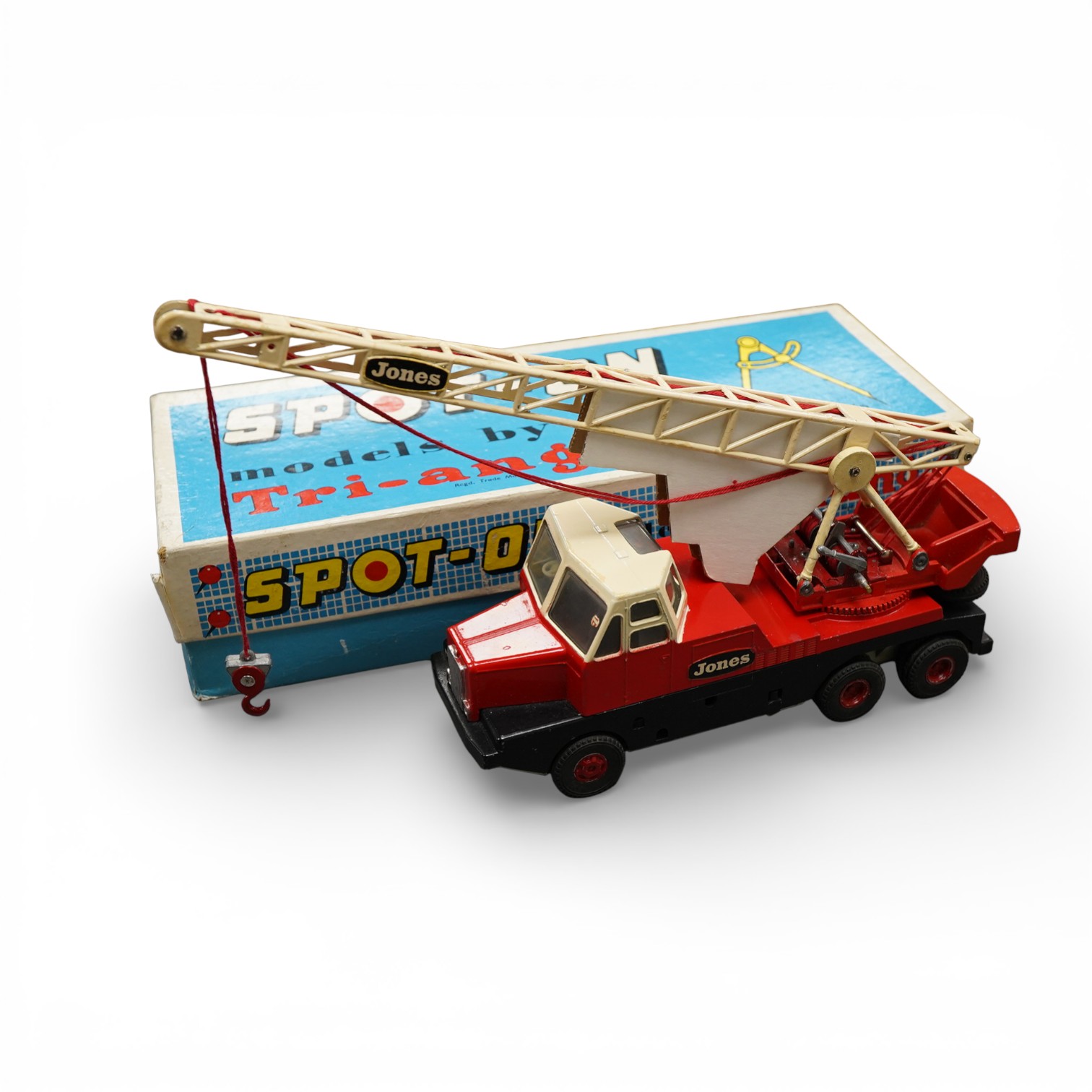 A boxed Tri-ang Spot-On Jones Crane (117), red body, with white cab and jib, with inner card packing piece, operating instructions and two winding handles