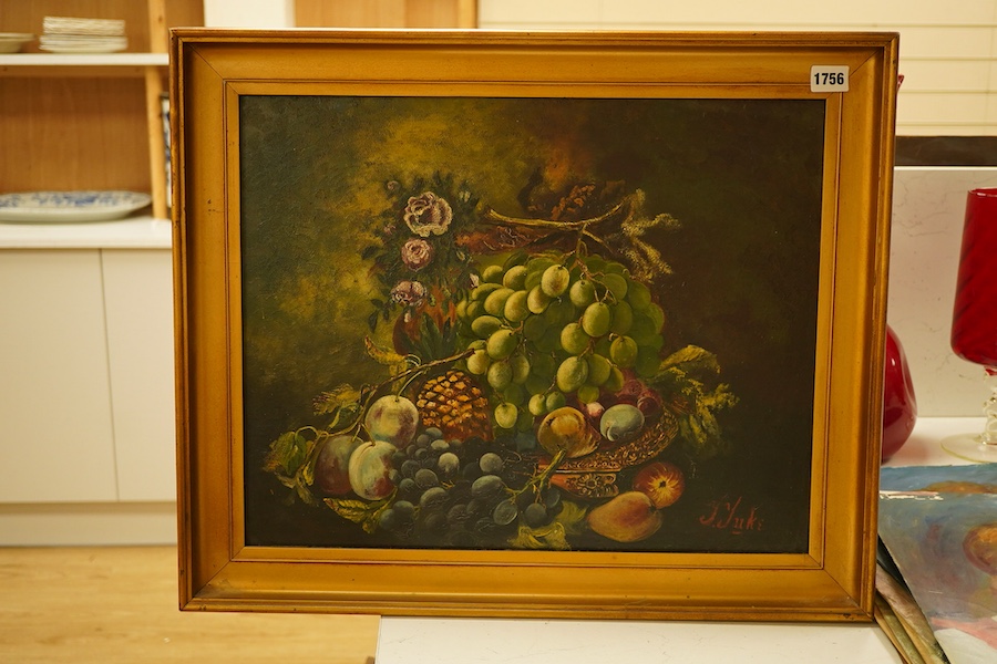 J. Juke, still life of fruit, signed, 20th century oil on board, 39 x 49cm