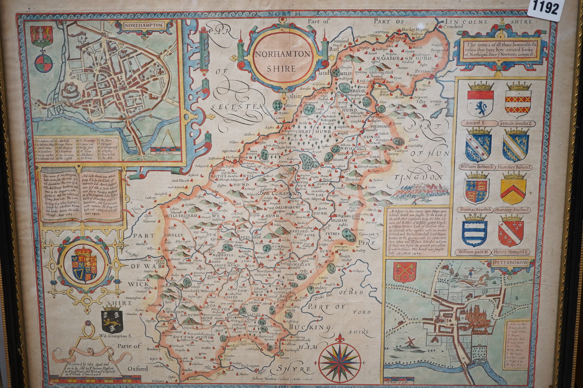 Lot 1192 , John Speed (1552-1629), ‘Northamptonshire’, hand coloured engraved map with inset town plans of Northampton & Peterborough and armorial shields, sold by Thomas Bassett and Richard Chiswell, English text verso, framed and