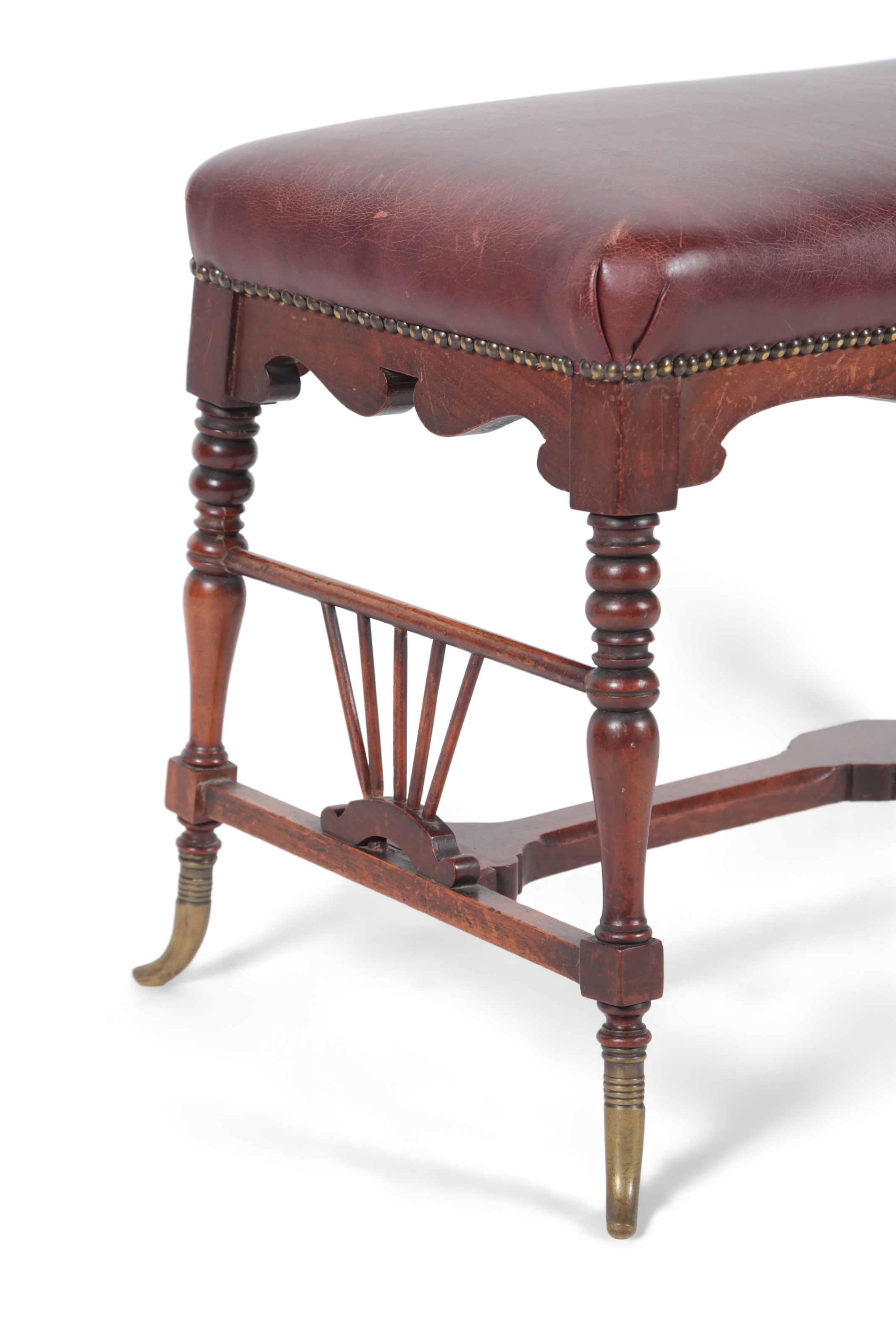 Manner of E.W. Godwin: An unusual Arts and Crafts mahogany duet stool, with splayed brass feet, bearing label under, ‘’S.R. Parsons, Furniture Rooms, 1813 & 1815, Notre Dame Street, Montreal, 50cm high x 82cm wide x 38cm deep