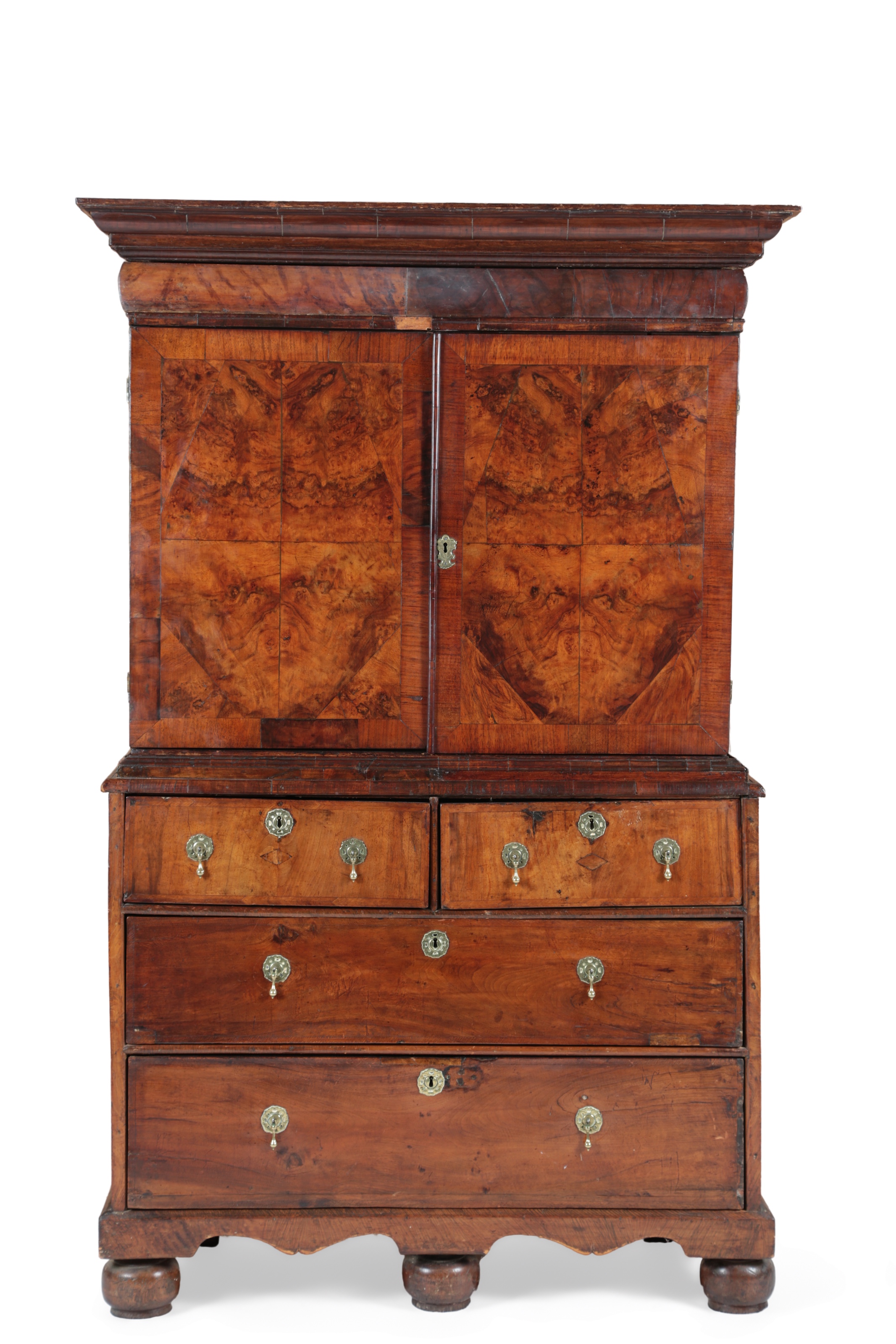 A William and Mary feather and crossbanded walnut cabinet on chest, the cushion moulded frieze drawer over a pair of doors with burr walnut veneer enclosing a fitted interior with a central cupboard and an arrangement of drawers and pigeonholes, the lower section with two short and two long drawers fitted with later drop handles, on bun feet, 107cm wide, 48cm deep, 168.5cm high