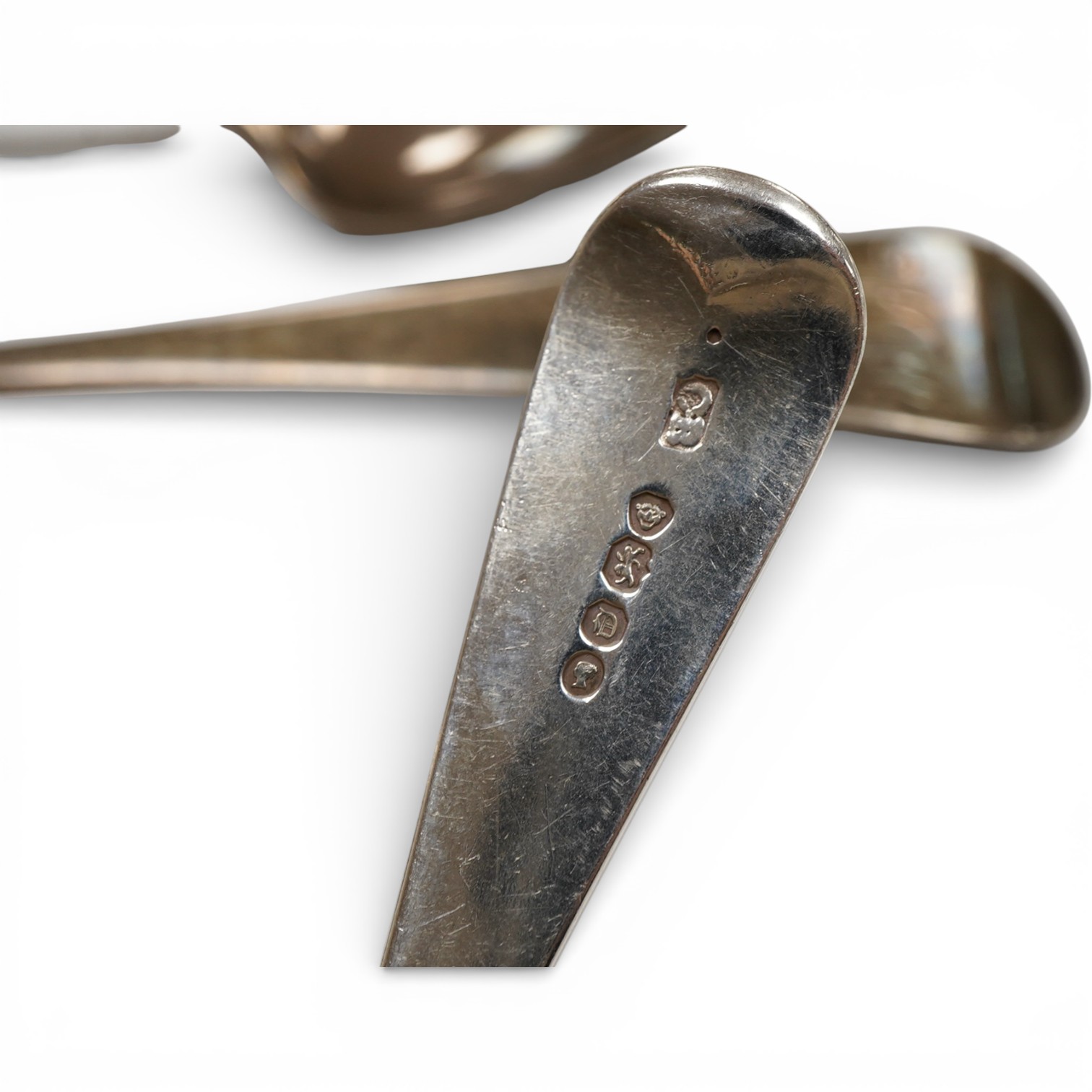 Lot 835 , A small group of George III and later silver Old English pattern flatware, comprising five table spoons, six dessert spoons and a sauce ladle, various dates and makers, 17.6oz.