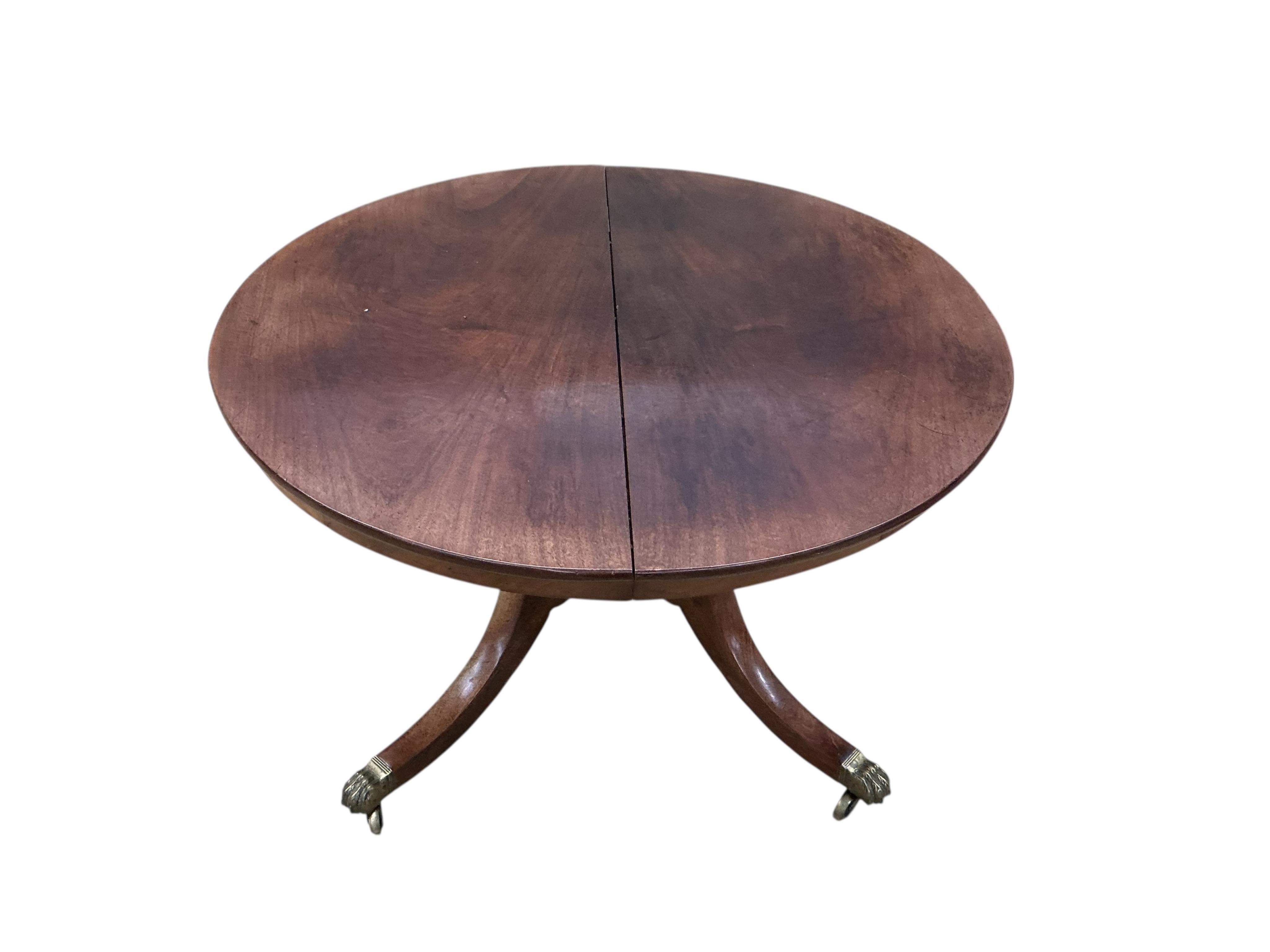 A Regency mahogany extending dining table, 168cm extended, one spare leaf, depth 120cm, height 72cm