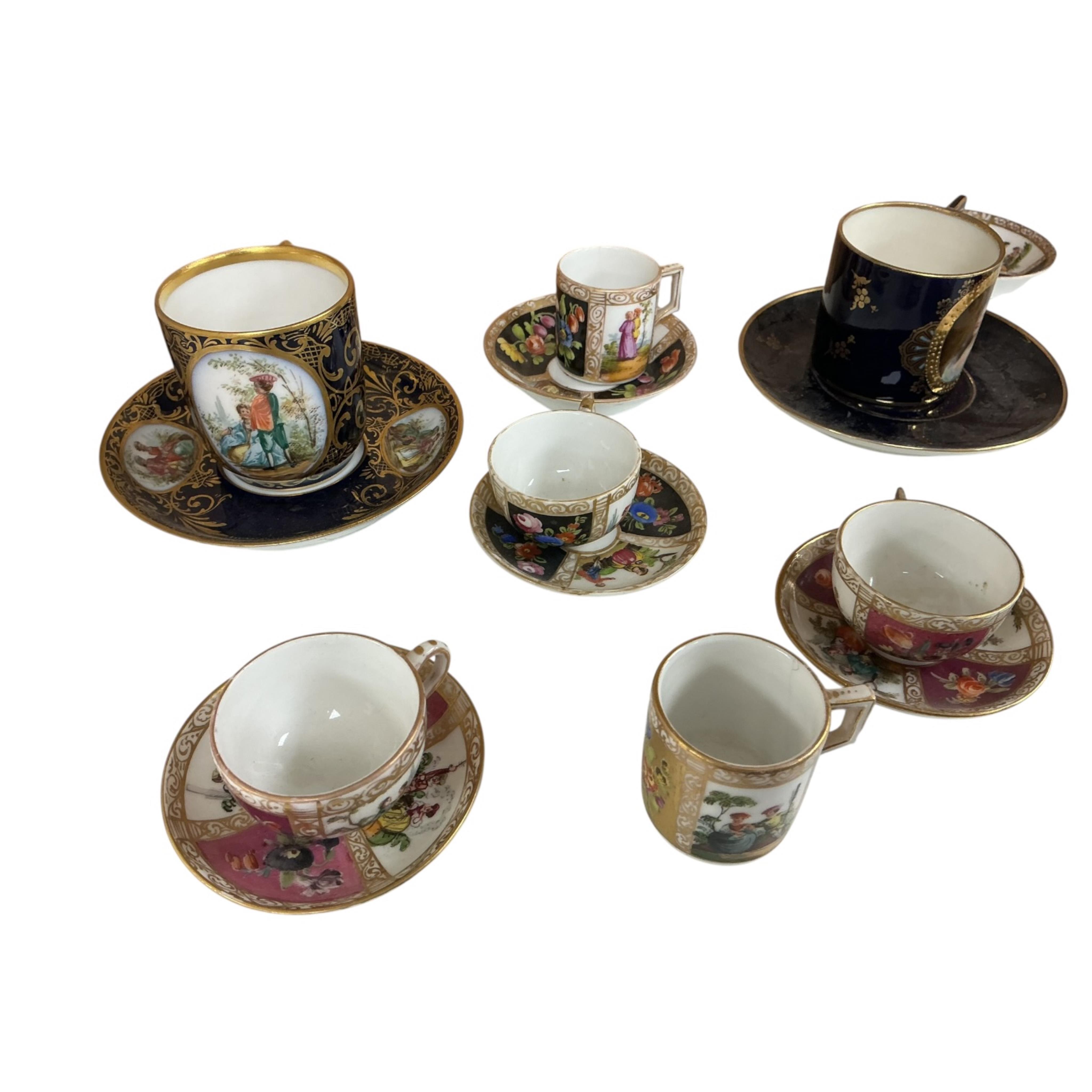 A collection of late 19th century Dresden Helena Wolfsohn decorated miniature cups and saucers and two Vienna style cabinet cups and saucers, largest cup 5cm high.