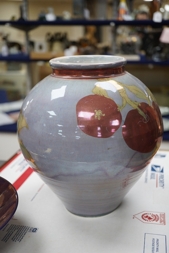 Lot 3202 , Jonathan Chiswell Jones (b.1944) a reduction fired lustre pottery vase decorated with fruiting apple branches, height 22cm and a smaller lustre floral dish.