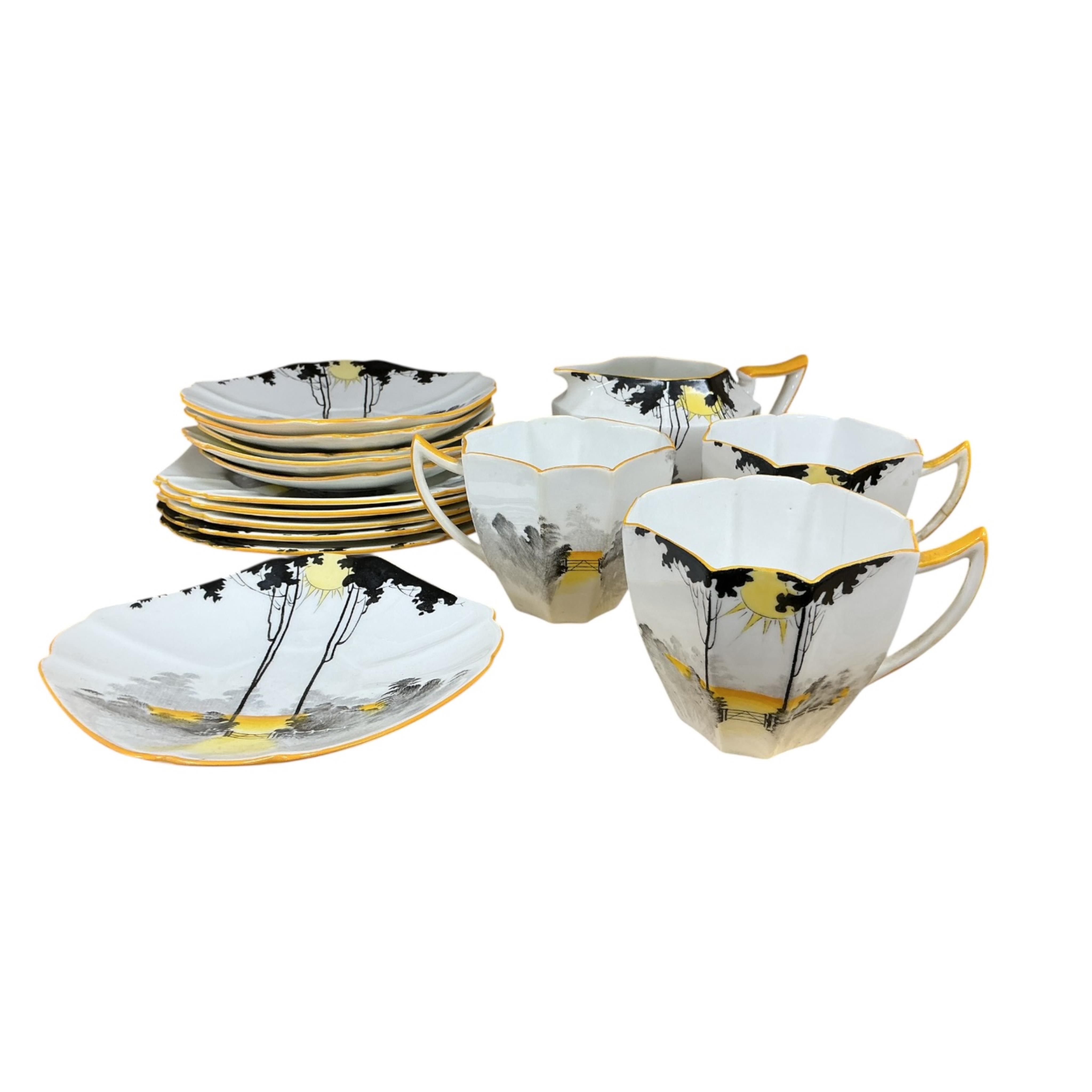 An Art Deco Shelley Tall Trees and Sunrise part tea set comprising a milk jug, three cups, six saucers and five larger saucers
