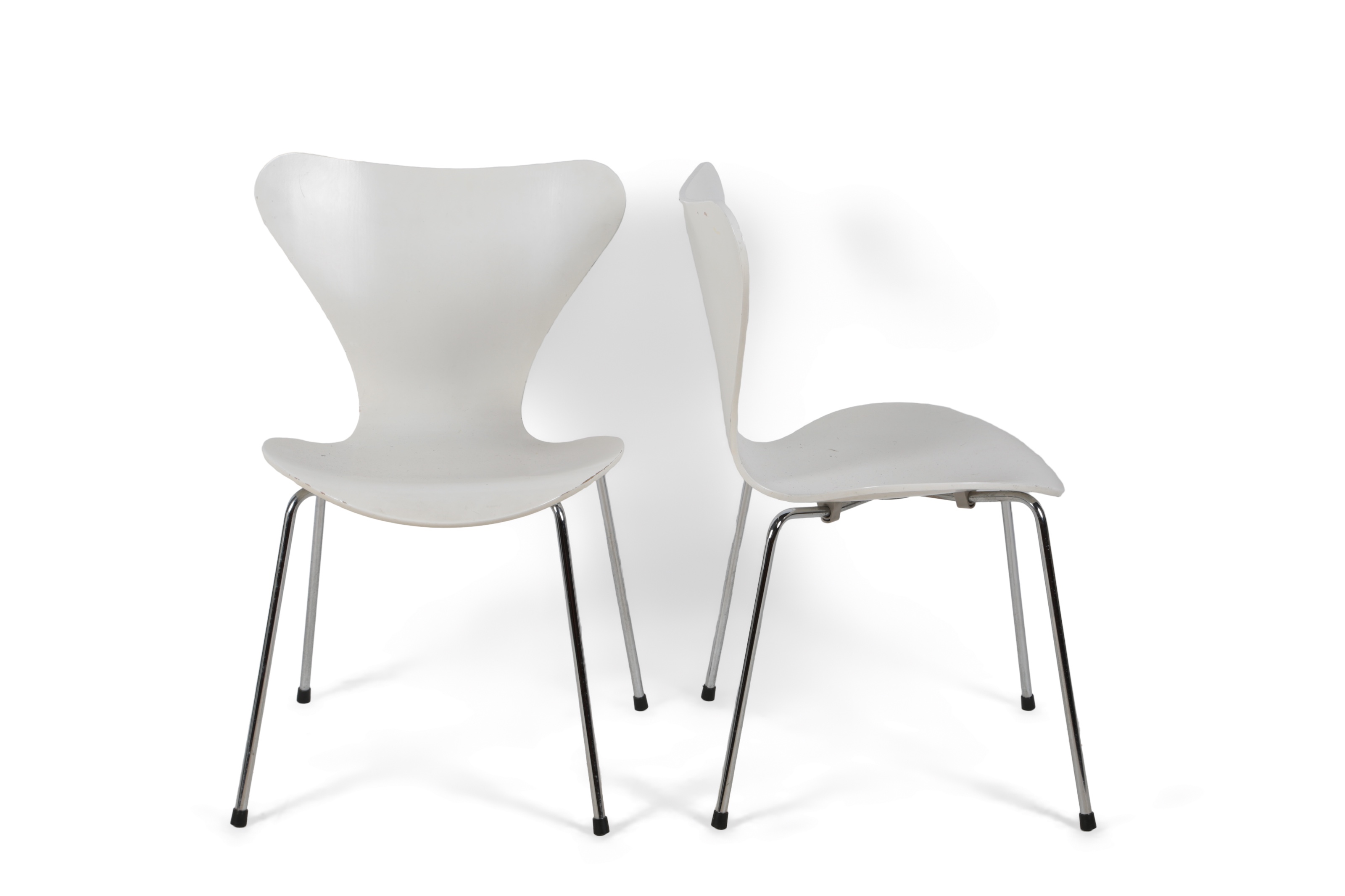 Arne Jacobsen (Danish 1902–1971) for Fritz Hansen: A set of eight 'Series 7' chairs, designed in 1955, the white-painted plywood shells raised on four chrome legs, manufacturer's label to the underside, each 76cm high x 50cm wide (8)
