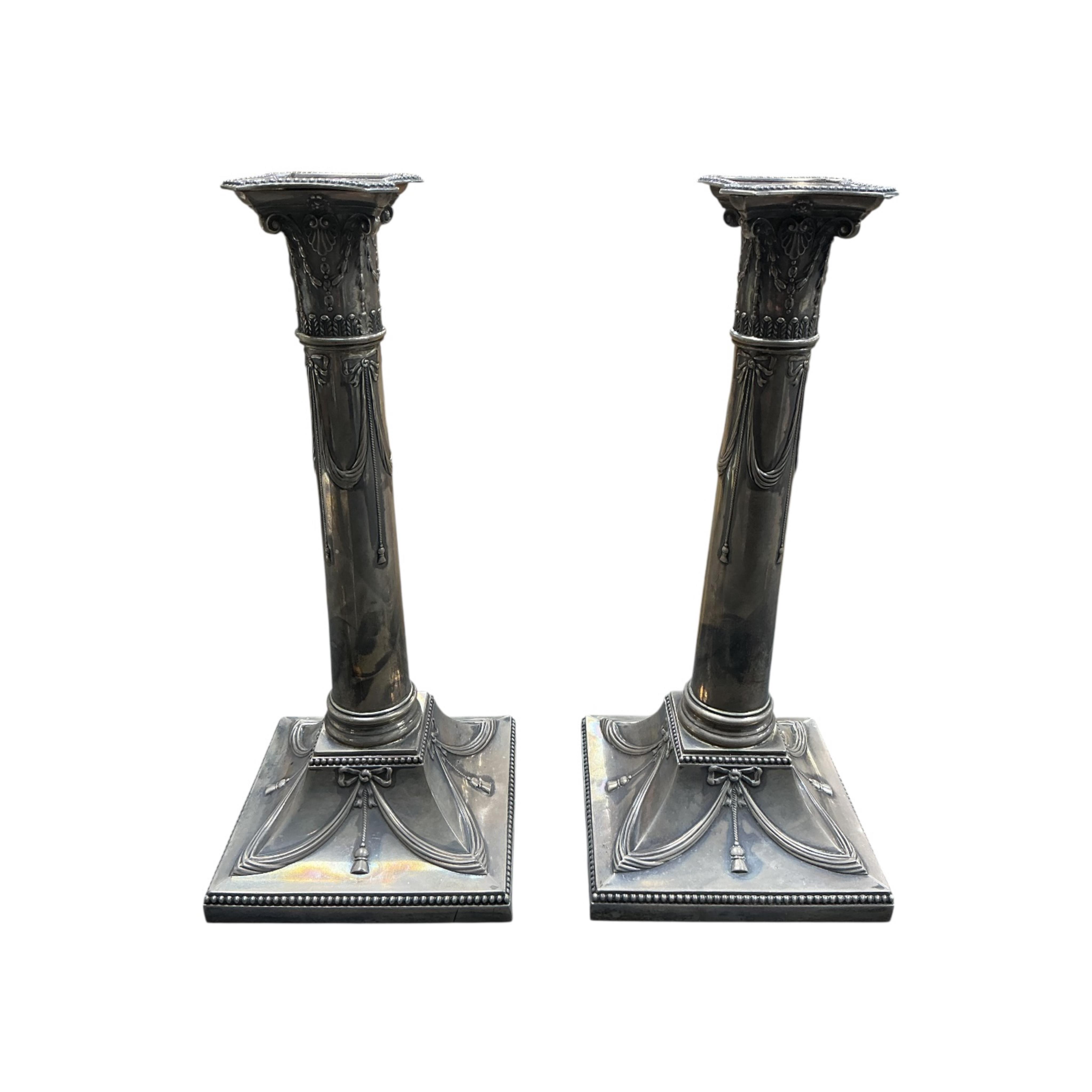 Lot 825 , A pair of late Victorian silver mounted candlesticks by Thomas Bradbury & Sons, London 1896, with swag and tassel decoration, height 26cm, weighted, together with two plate mounted glass oil lamp reservoirs.