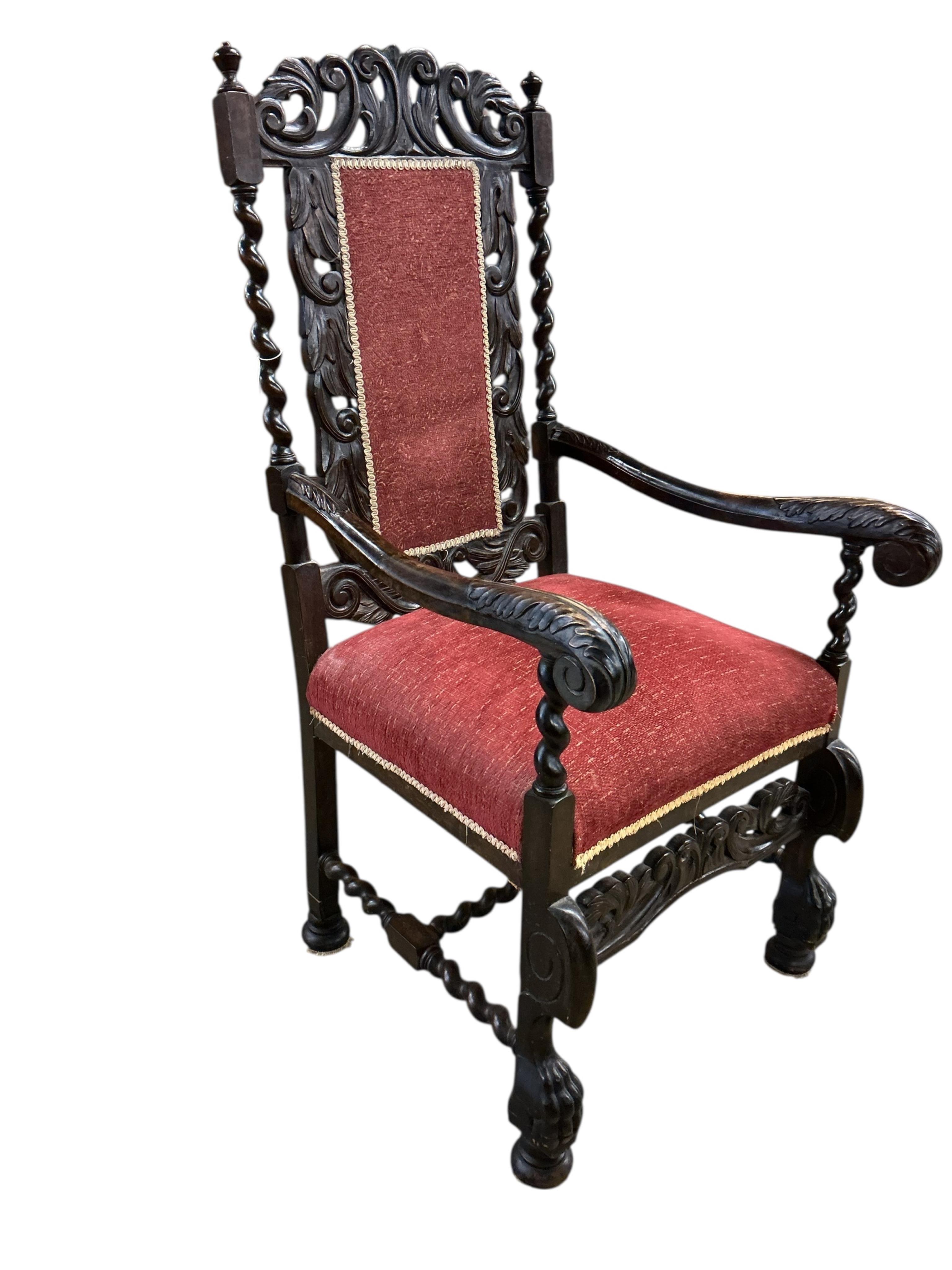 Lot 203 , A Charles II style carved walnut and beech ‘throne’ chair, width 70cm, depth 70cm, height 136cm