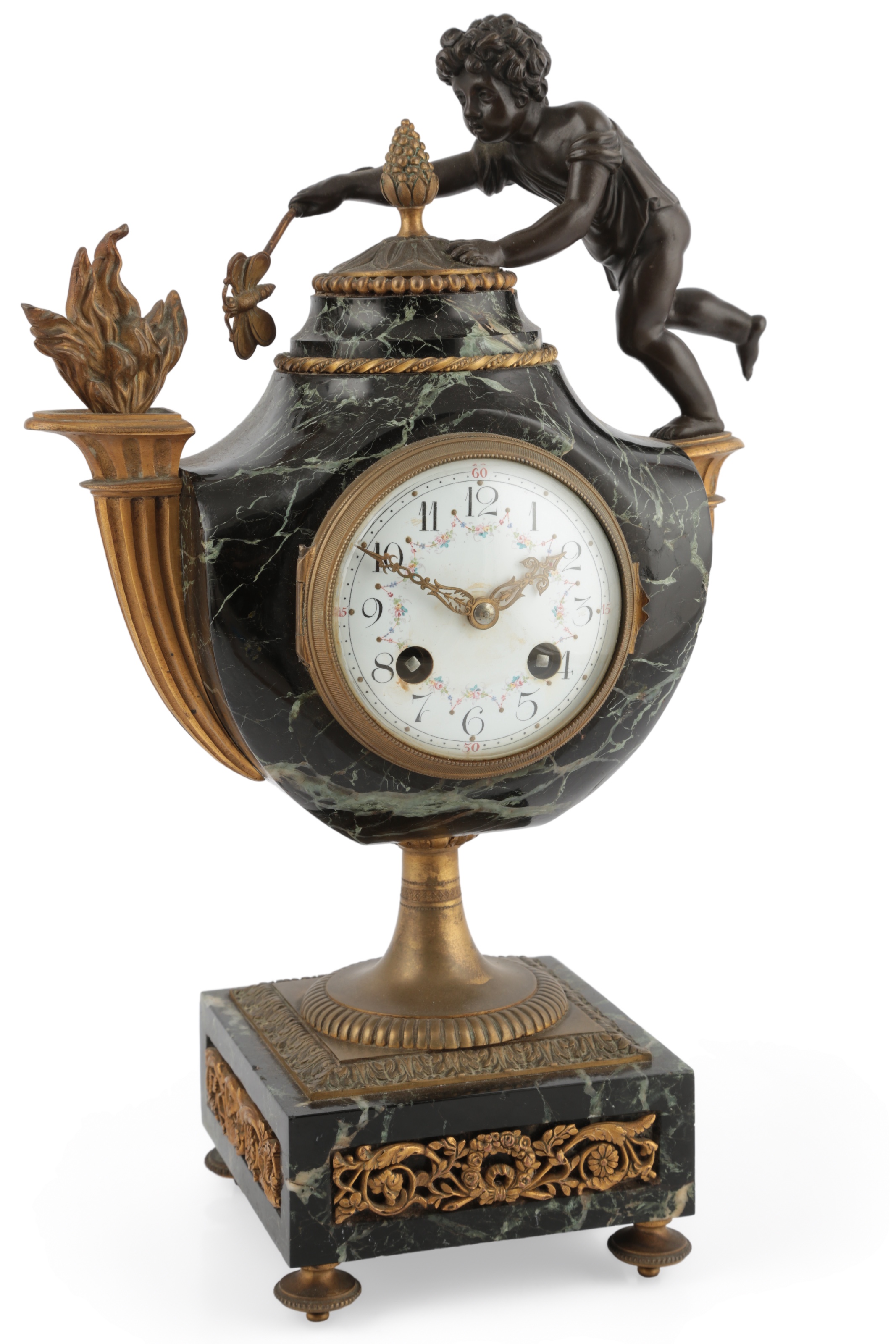 the clock of oil lamp form, modelled with the bronze figure of a boy holding a giant insect on a stick, the white enamel dial with Arabic numerals, the French brass drum movement with outside count wheel, striking on a bell, 36cm high, the pair of matching candelabra modelled with a bronze figure of a satyr, standing before rose branches, each on ormolu mounted marble bases, 27cm high