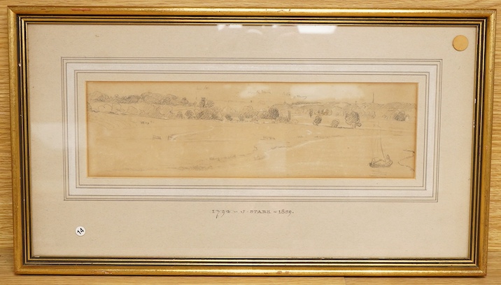 James Stark (1794-1859), ‘Landscape near Norwich’, unsigned, Cromer Antique Gallery label and inscribed ‘Brought at Sothebys, 23rd July 1947, lot 7’, pencil, 9.5 x 33cm