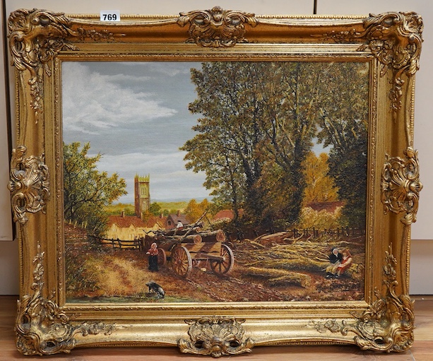 Lot 769 , Victorian style, village scene with a cart, church beyond, indistinctly signed and dated 1984, oil on canvas board