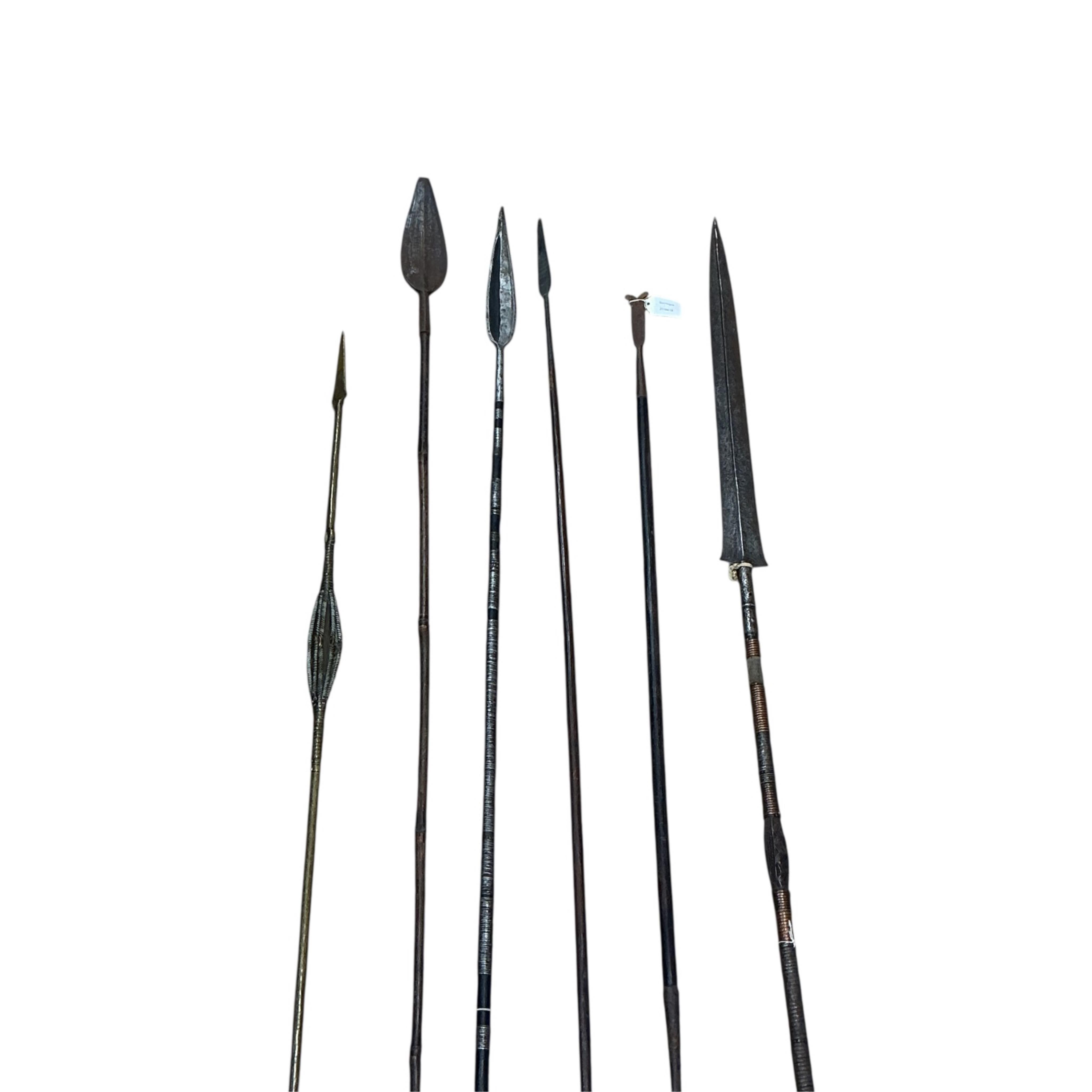 A Ngombe spear, Democratic Republic of Congo, four African Spears and a metal tipped staff (6)
