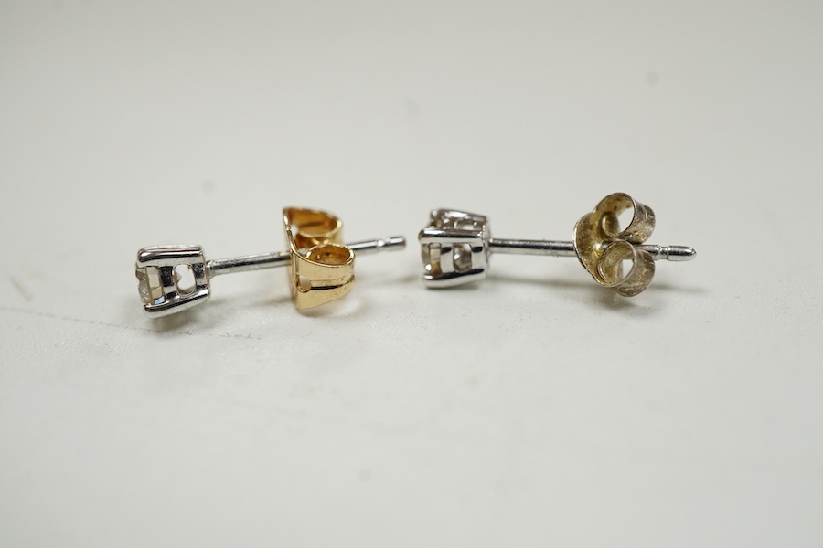 A pair of white metal and solitaire diamond set ear studs, each stone diameter approx. 3mm.