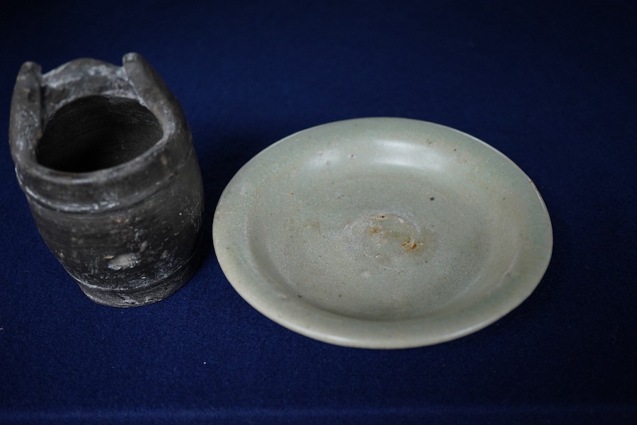 A Yuan green pottery glazed dish and bucket - 10cm high