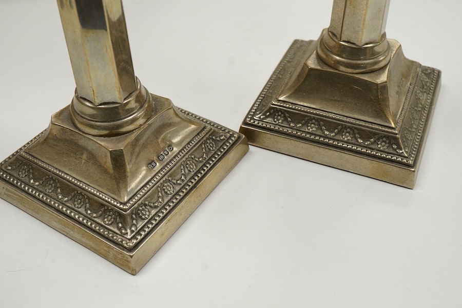 A pair of George VI silver mounted candlesticks, maker RS, London, 1939, with octagonal stems, on square bases, 29.6cm, weighted.
