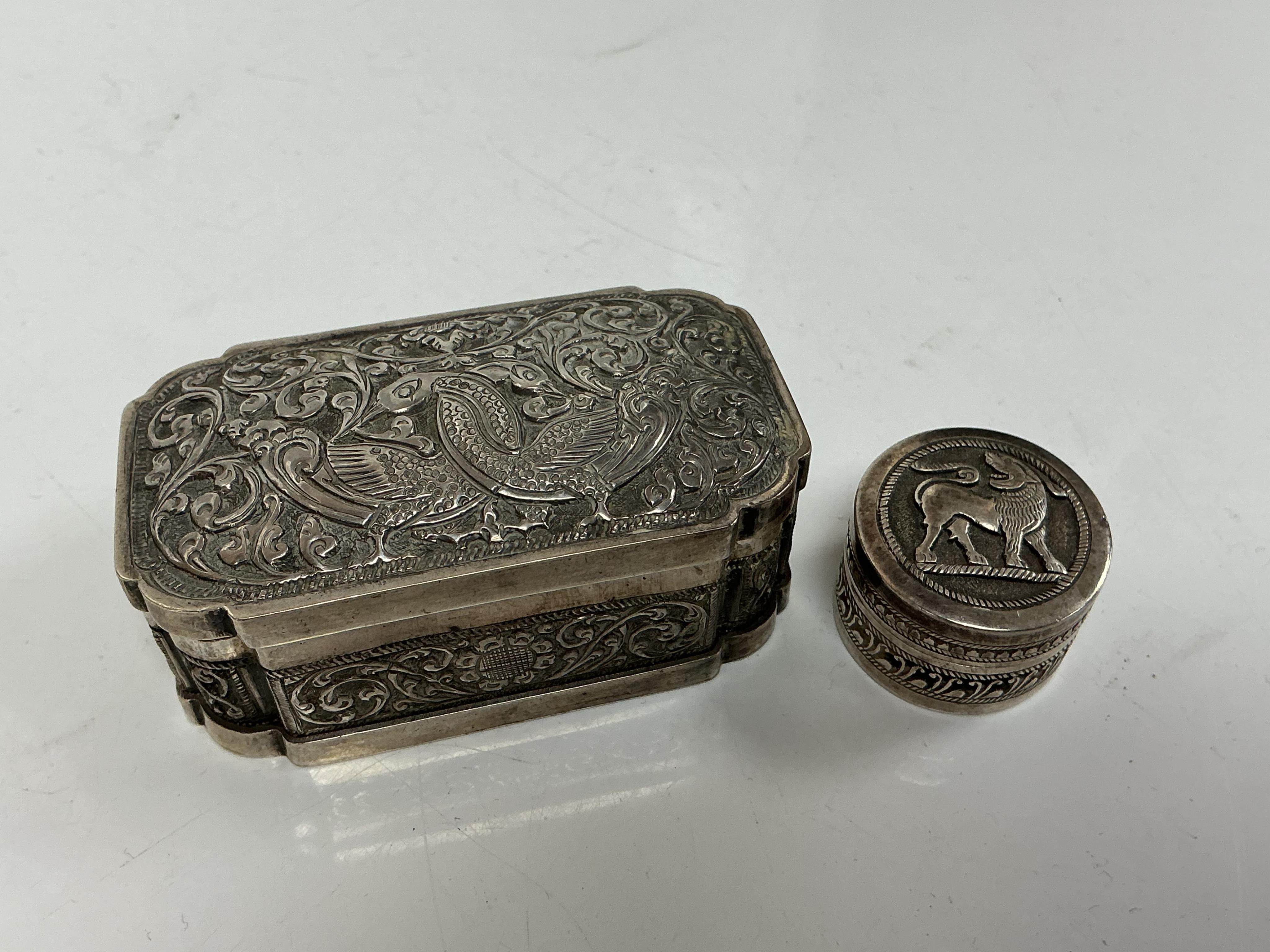 Lot 1832 , An early to mid 20th century Indian embossed white metal shaped rectangular snuff box, 71mm, together with a similar circular pill box, stamped KAA.