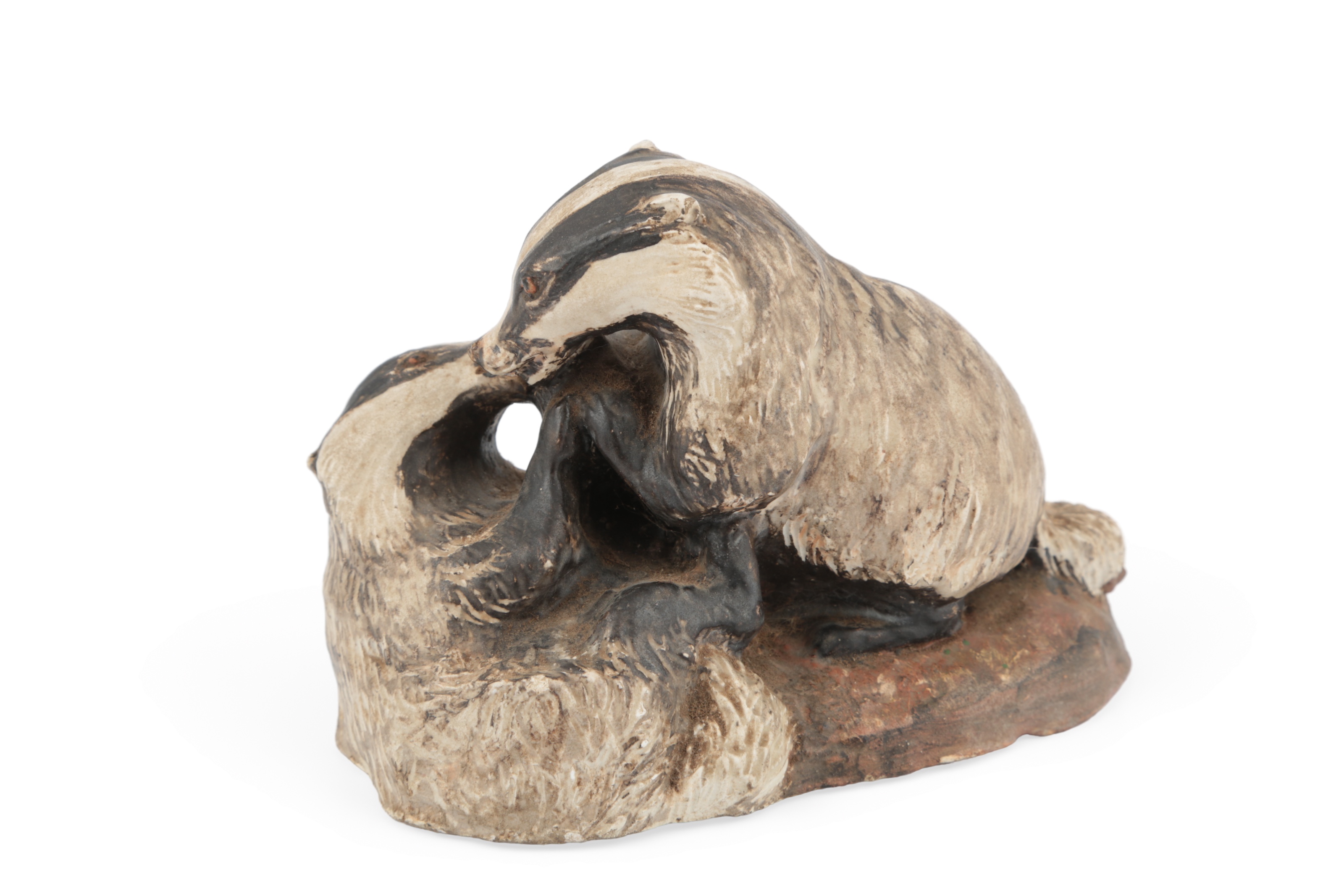 a painted pottery group of two cubs at play, the base with incised signature, date and title, 9cm high x 13cm wide