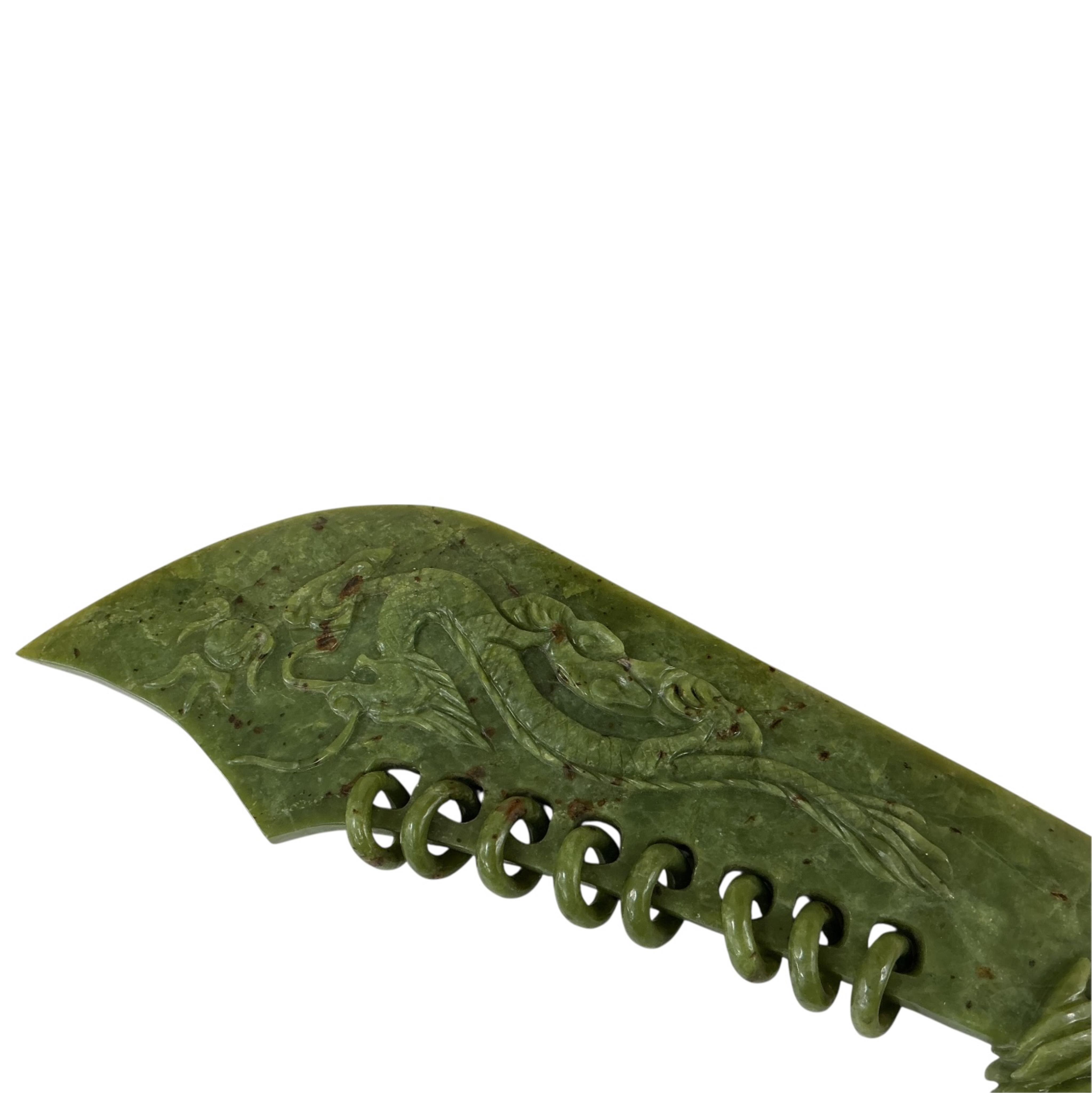 A bowenite jade model scimitar, length 50cm.