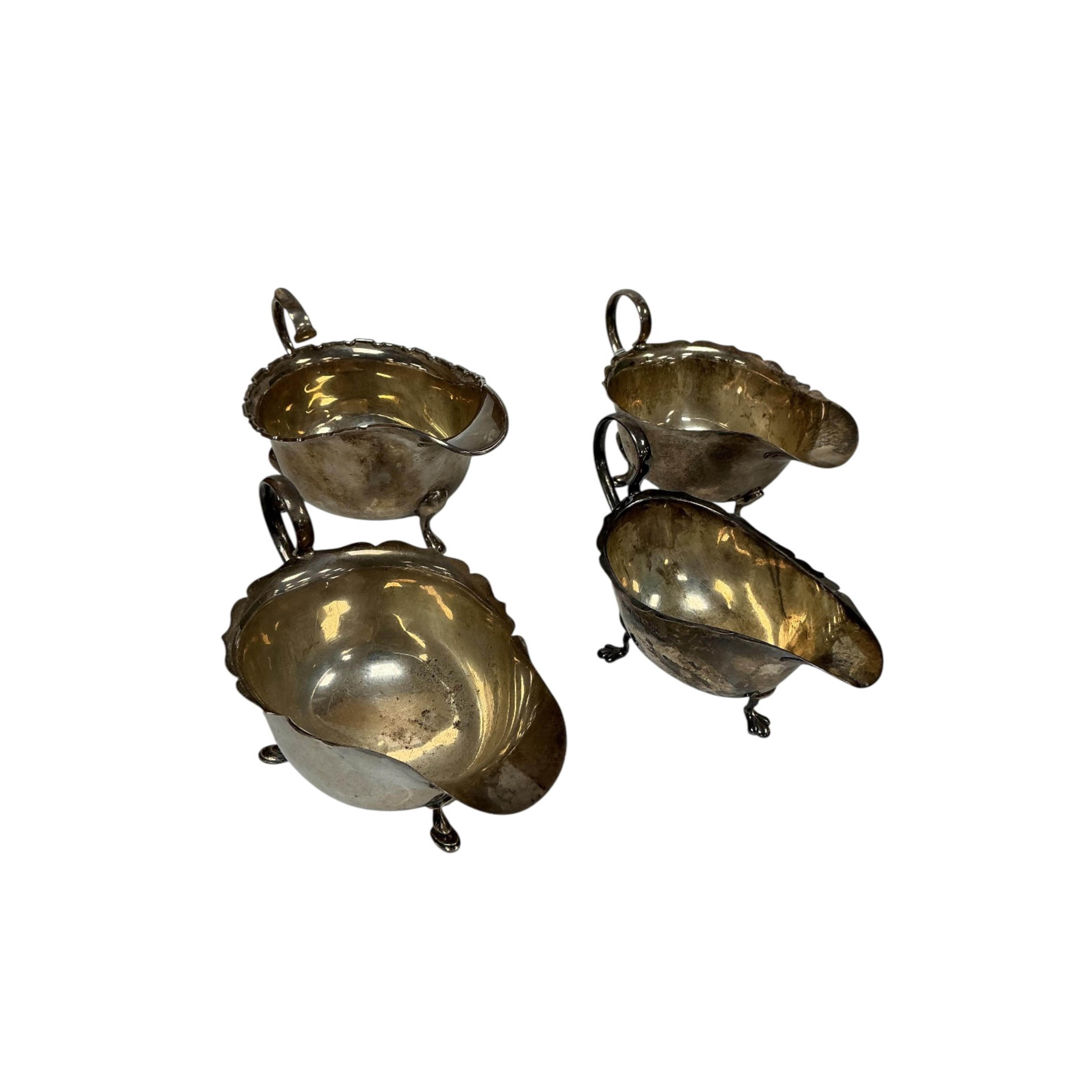 Lot 1842 , A pair of George V silver sauceboats, by Mappin & Webb, Sheffield, 1933, length 15.9cm, together with two other George V silver sauceboats, Roberts & Dore, Birmingham, 1931 and Mappin & Webb, Birmingham, 1933, 14oz.