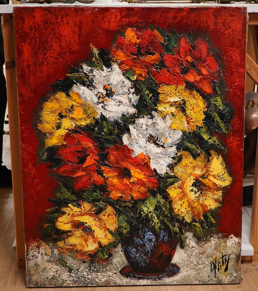 Henri D’Anty (French, 1910-1998), still life of flowers in a vase, signed, oil with impasto on canvas, unframed, 92 x 73cm