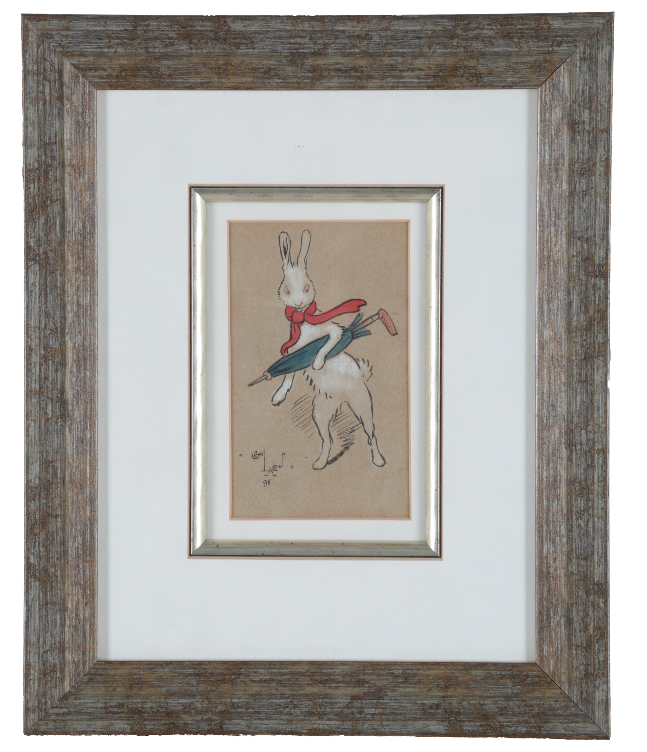 Lot 8 , Cecil Aldin, (1870-1935), Study of a white rabbit wearing a red scarf and holding an umbrella
